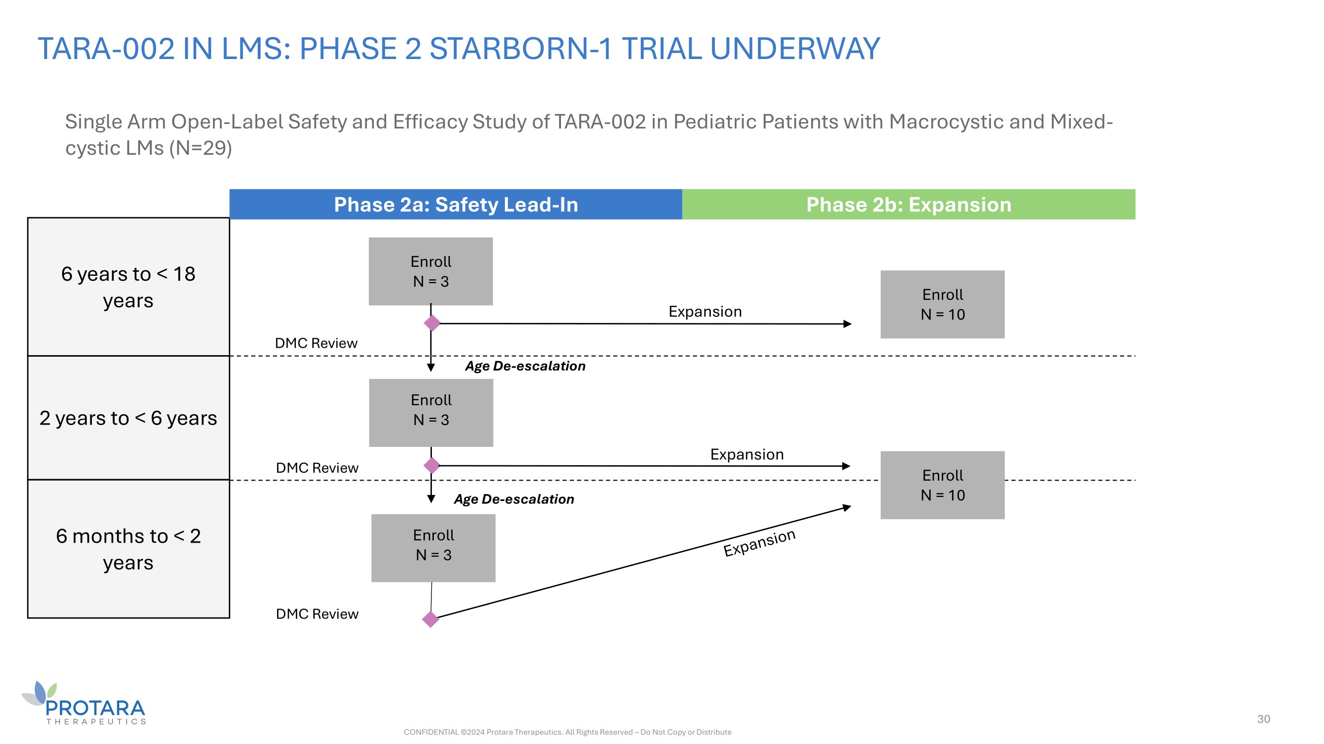 30 TARA - 002 IN LMS: PHASE 2 STARBORN - 1 TRIAL UNDERWAY Single Arm Open - Label Safety and Efficacy Study of TARA - 002 in Pediatric Patients with Macrocystic and Mixed - cystic LMs (N=29) 6 years to < 18 years 2 years to < 6 years 6 months to < 2 years Phase 2a: Safety Lead - In Phase 2b: Expansion Enroll N = 3 Enroll N = 3 Expansion Age De - escalation Age De - escalation Expansion DMC Review DMC Review DMC Review Enroll N = 3 Enroll N = 10 Enroll N = 10 CONFIDENTIAL ©2024 Protara Therapeutics. All Rights Reserved – Do Not Copy or Distribute