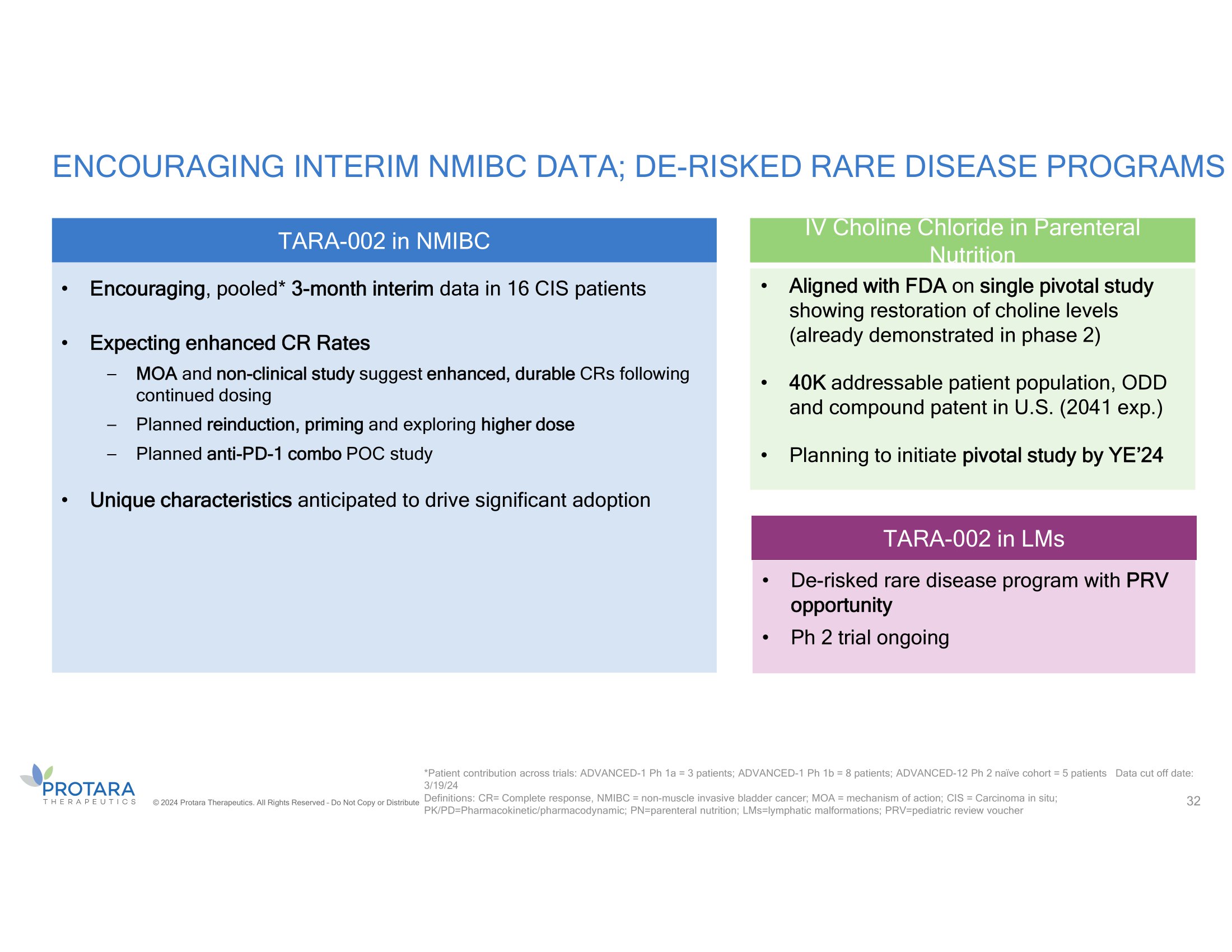 ENCOURAGING INTERIM NMIBC DATA; DE - RISKED RARE DISEASE PROGRAMS © 2024 Protara Therapeutics. All Rights Reserved – Do Not Copy or Distribute *Patient contribution across trials: ADVANCED - 1 Ph 1a = 3 patients; ADVANCED - 1 Ph 1b = 8 patients; ADVANCED - 12 Ph 2 naïve cohort = 5 patients Data cut off date: 3/19/24 Definitions: CRR= Complete response rate, BCG = Bacillus Calmette - Guérin; NMIBC = non - muscle invasive bladder cancer; MOA = mechanism of action; CIS = Carcinoma in 32 situ; PK/PD=Pharmacokinetic/pharmacodynamic; PN=parenteral nutrition; LMs=lymphatic malformations; PRV=pediatric review voucher TARA - 002 in NMIBC IV Choline Chloride in Parenteral Nutrition • Aligned with FDA on single pivotal study showing restoration of choline levels (already demonstrated in phase 2) • 40K addressable patient population, ODD and compound patent in U.S. (2041 exp.) • Planning to initiate pivotal study by YE’24 TARA - 002 in LMs • De - risked rare disease program with PRV opportunity • Ph 2 trial ongoing • Encouraging , pooled* 3 - month interim data in 16 CIS patients • Expecting enhanced CR Rates – MOA and non - clinical study suggest enhanced, durable CRs following continued dosing – Planned reinduction, priming and exploring higher dose – Planned anti - PD - 1 combo POC study • Unique characteristics anticipated to drive significant adoption