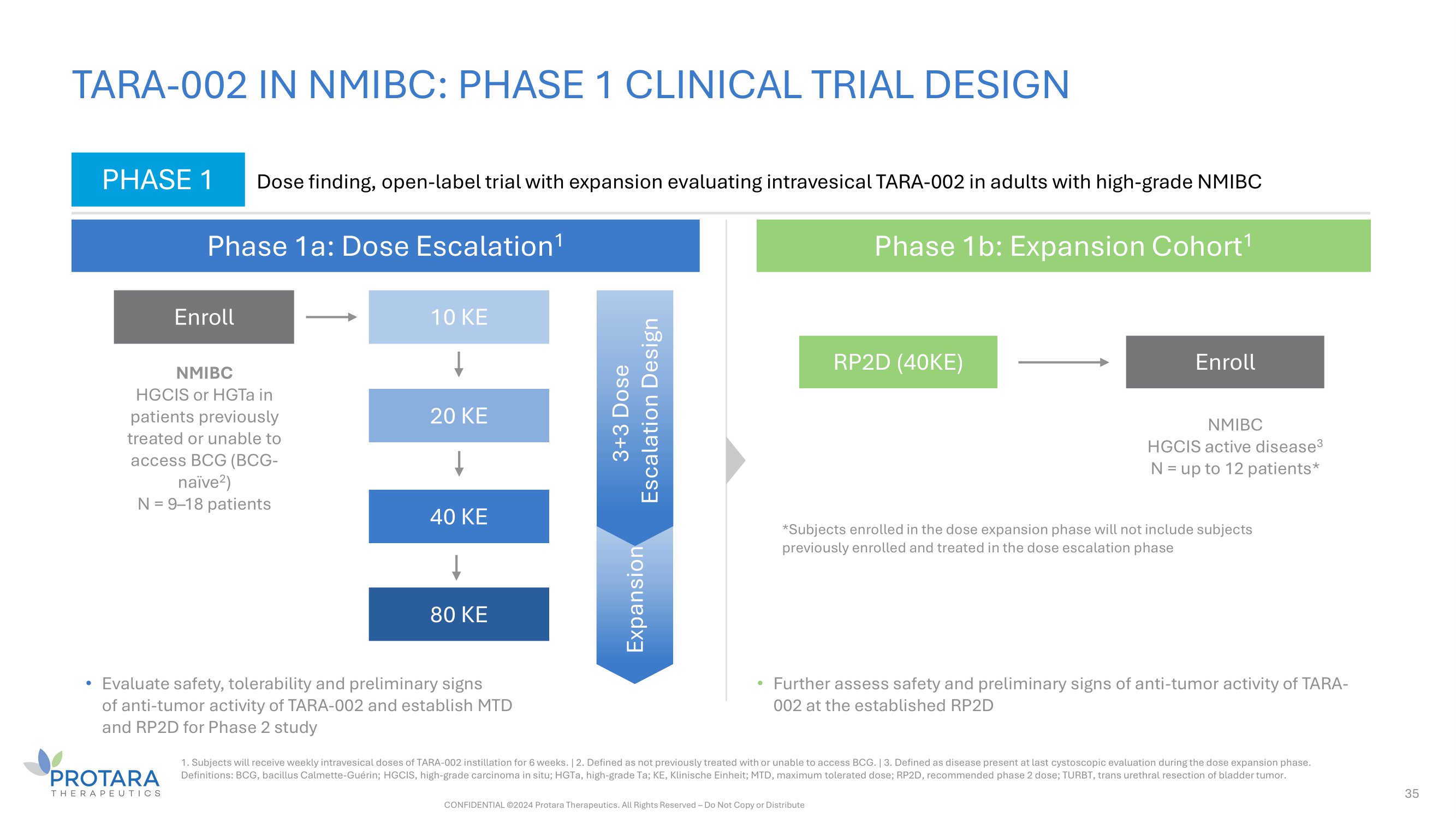 Expansion TARA - 002 IN NMIBC: PHASE 1 CLINICAL TRIAL DESIGN PHASE 1 Dose finding, open - label trial with expansion evaluating intravesical TARA - 002 in adults with high - grade NMIBC Phase 1a: Dose Escalation 1 Phase 1b: Expansion Cohort 1 3+3 Dose Esc alation Design Enroll 10 KE 20 KE 40 KE NMIBC HGCIS or HGTa in patients previously treated or unable to access BCG (BCG - naïve 2 ) N = 9 – 18 patients • Evaluate safety, tolerability and preliminary signs of anti - tumor activity of TARA - 002 and establish MTD and RP2D for Phase 2 study Enroll RP2D (40KE) NMIBC HGCIS active disease 3 N = up to 12 patients* *Subjects enrolled in the dose expansion phase will not include subjects previously enrolled and treated in the dose escalation phase • Further assess safety and preliminary signs of anti - tumor activity of TARA - 002 at the established RP2D 1. Subjects will receive weekly intravesical doses of TARA - 002 instillation for 6 weeks. | 2. Defined as not previously treated with or unable to access BCG. | 3. Defined as disease present at last cystoscopic evaluation during the dose expansion phase. Definitions: BCG, bacillus Calmette - Guérin; HGCIS, high - grade carcinoma in situ; HGTa, high - grade Ta; KE, Klinische Einheit; MTD, maximum tolerated dose; RP2D, recommended phase 2 dose; TURBT, trans urethral resection of bladder tumor. 35 CONFIDENTIAL ©2024 Protara Therapeutics. All Rights Reserved – Do Not Copy or Distribute 80 KE