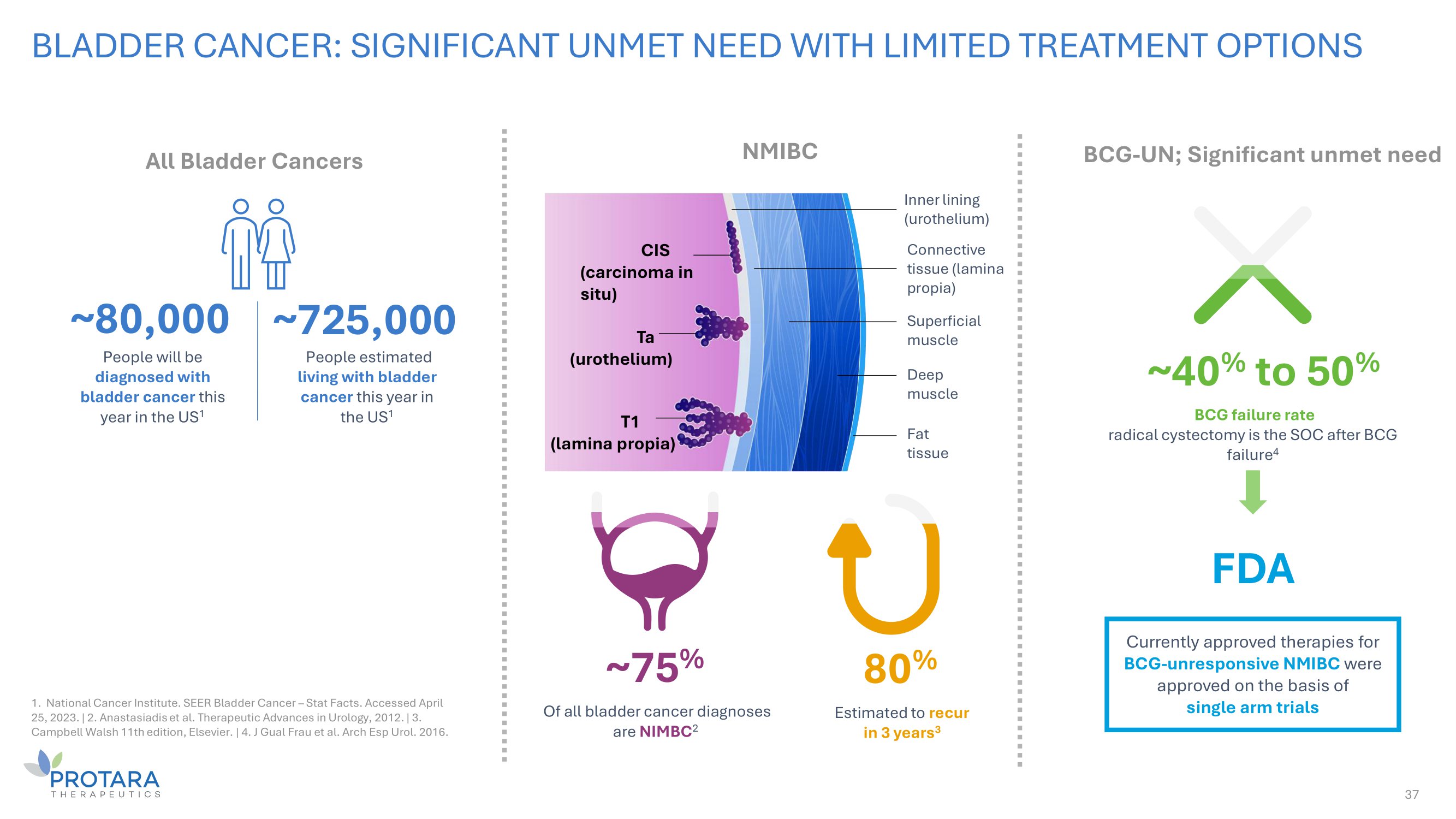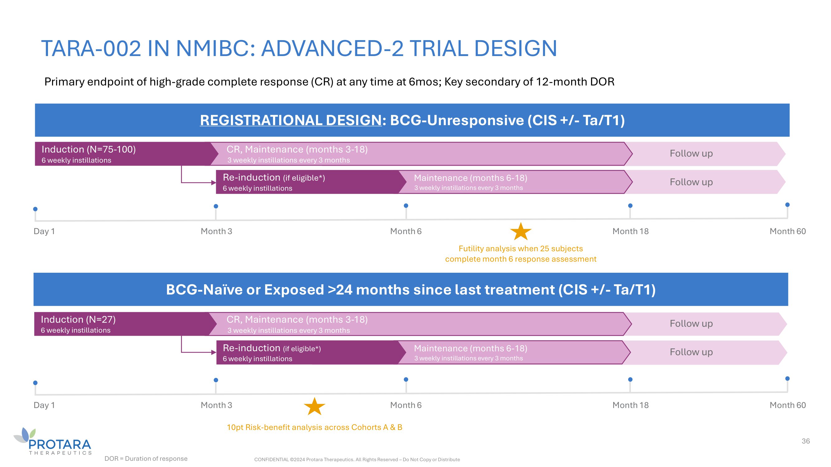 TARA - 002 IN NMIBC: ADVANCED - 2 TRIAL DESIGN 36 REGISTRATIONAL DESIGN : BCG - Unresponsive (CIS +/ - Ta/T1) Primary endpoint of high - grade complete response (CR) at any time at 6mos; Key secondary of 12 - month DOR Maintenance (months 6 - 18) 3 weekly instillations every 3 months Induction (N=27) 6 weekly instillations Futility analysis when 25 subjects complete month 6 response assessment CR, Maintenance (months 3 - 18) 3 weekly instillations every 3 months Re - induction (if eligible*) 6 weekly instillations Follow up Follow up CONFIDENTIAL ©2024 Protara Therapeutics. All Rights Reserved – Do Not Copy or Distribute DOR = Duration of response Maintenance (months 6 - 18) 3 weekly instillations every 3 months Follow up Follow up Induction (N=75 - 100) 6 weekly instillations CR, Maintenance (months 3 - 18) 3 weekly instillations every 3 months Re - induction (if eligible*) 6 weekly instillations BCG - Naïve or Exposed >24 months since last treatment (CIS +/ - Ta/T1) Month 18 Month 60 Day 1 Month 3 Month 6 10pt Risk - benefit analysis across Cohorts A & B Month 18 Month 60 Month 6 Day 1 Month 3