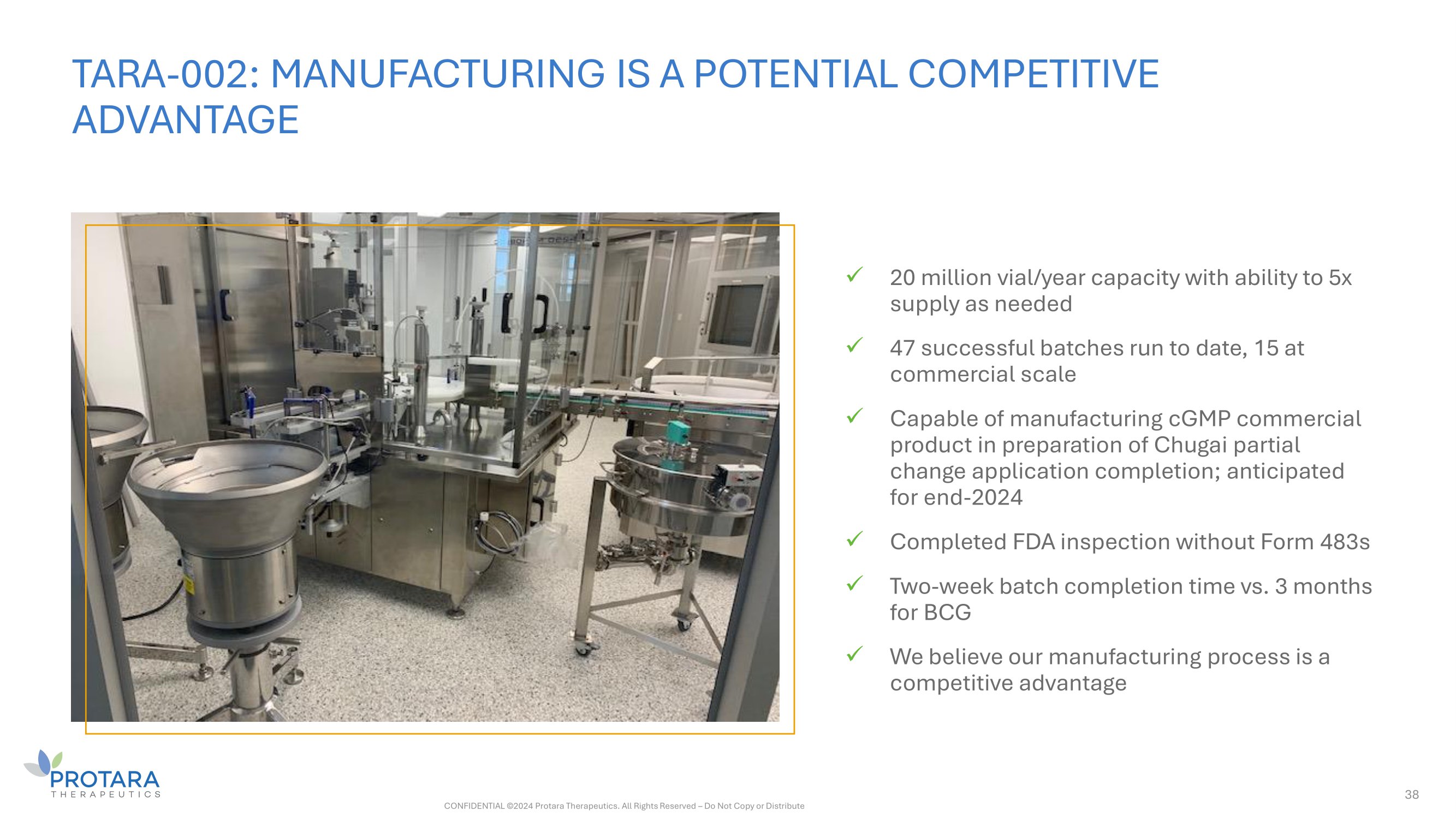 TARA - 002: MANUFACTURING IS A POTENTIAL COMPETITIVE ADVANTAGE 38 x 20 million vial/year capacity with ability to 5x supply as needed x 47 successful batches run to date, 15 at commercial scale x Capable of manufacturing cGMP commercial product in preparation of Chugai partial change application completion; anticipated for end - 2024 x Completed FDA inspection without Form 483s x Two - week batch completion time vs. 3 months for BCG x We believe our manufacturing process is a competitive advantage CONFIDENTIAL ©2024 Protara Therapeutics. All Rights Reserved – Do Not Copy or Distribute