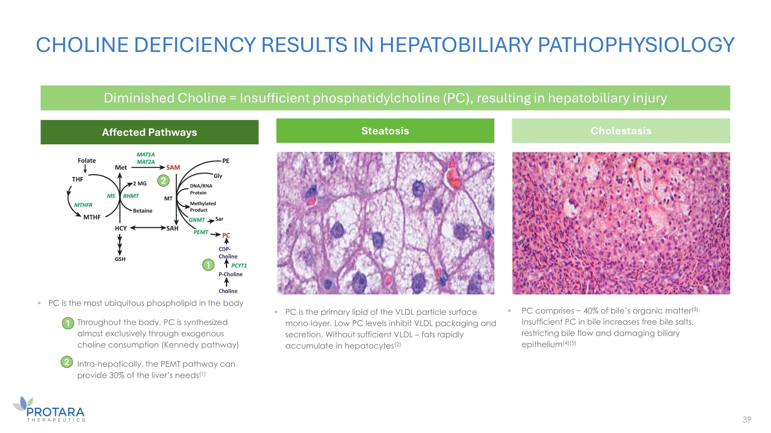 CHOLINE DEFICIENCY RESULTS IN HEPATOBILIARY PATHOPHYSIOLOGY 39 Diminished Choline = Insufficient phosphatidylcholine (PC), resulting in hepatobiliary injury ▪ PC is the primary lipid of the VLDL particle surface mono - layer. Low PC levels inhibit VLDL packaging and secretion. Without sufficient VLDL – fats rapidly accumulate in hepatocytes (2) Steatosis Cholestasis ▪ PC comprises ~ 40% of bile’s organic matter (3). Insufficient PC in bile increases free bile salts, restricting bile flow and damaging biliary epithelium (4)(5) Affected Pathways 2 1 ▪ PC is the most ubiquitous phospholipid in the body Intra - hepatically, the PEMT pathway can provide 30% of the liver’s needs (1) 1 ▪ Throughout the body, PC is synthesized almost exclusively through exogenous choline consumption (Kennedy pathway) 2 ▪