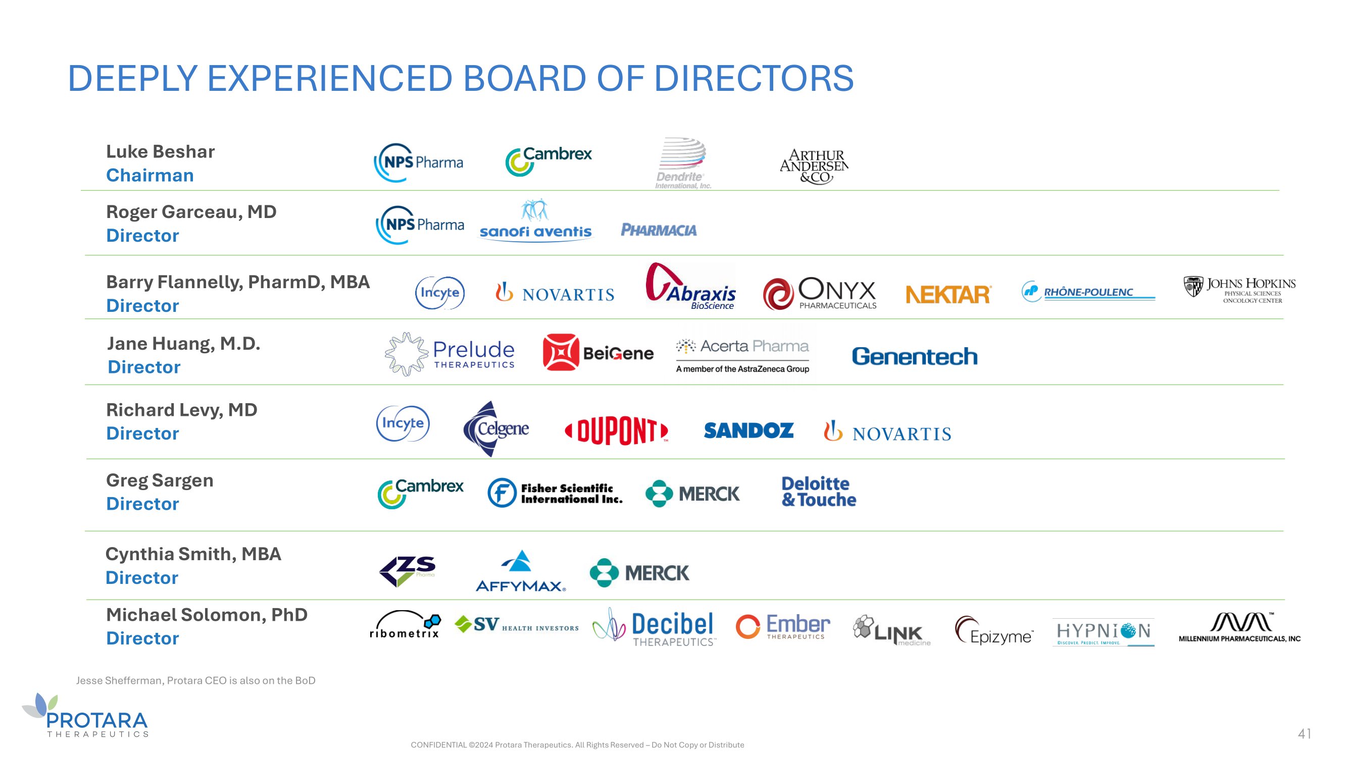 DEEPLY EXPERIENCED BOARD OF DIRECTORS 41 Luke Beshar Chairman Roger Garceau, MD Director Barry Flannelly, PharmD, MBA Director Jane Huang, M.D. Director Richard Levy, MD Director Greg Sargen Director Cynthia Smith, MBA Director Michael Solomon, PhD Director CONFIDENTIAL ©2024 Protara Therapeutics. All Rights Reserved – Do Not Copy or Distribute Jesse Shefferman, Protara CEO is also on the BoD