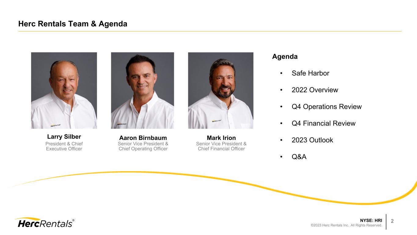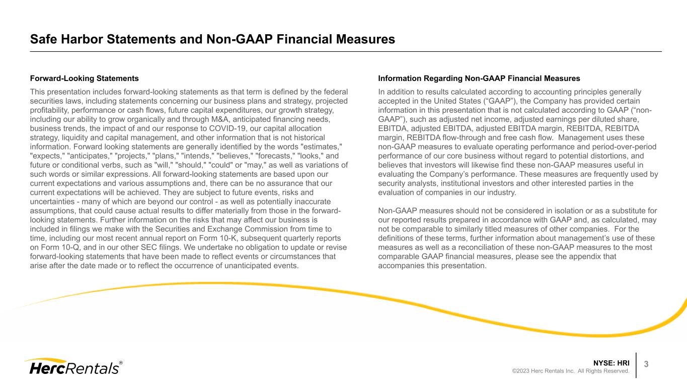 NYSE: HRI ©2023 Herc Rentals Inc. All Rights Reserved. 2 Larry Silber President & Chief Executive Officer Herc Rentals Team & Agenda Mark Irion Senior Vice President & Chief Financial Officer Aaron Birnbaum Senior Vice President & Chief Operating Officer Agenda • Safe Harbor • 2022 Overview • Q4 Operations Review • Q4 Financial Review • 2023 Outlook • Q&A