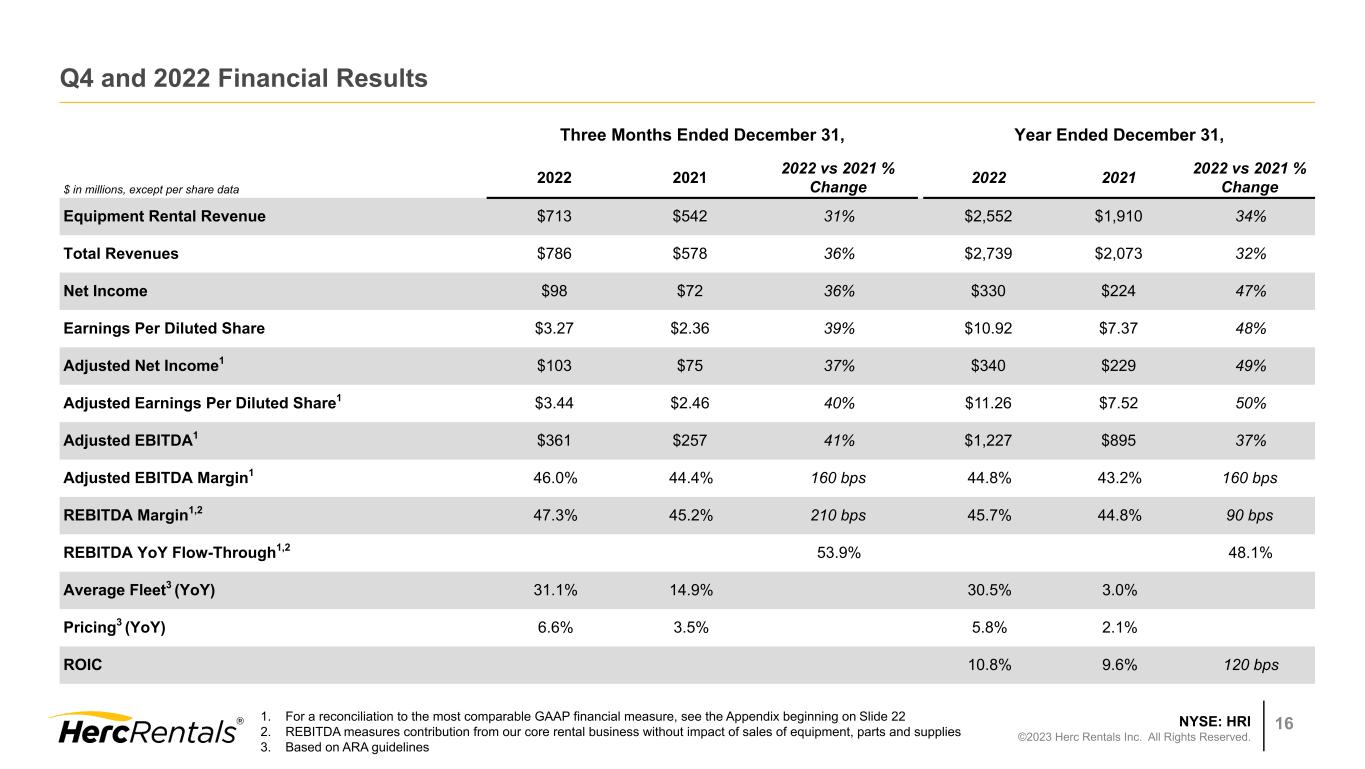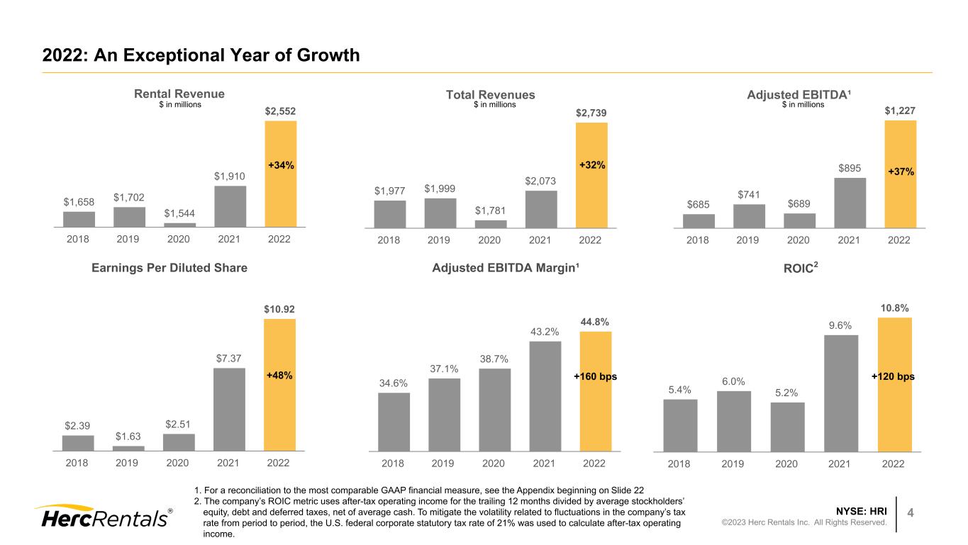 NYSE: HRI ©2023 Herc Rentals Inc. All Rights Reserved. 3 Safe Harbor Statements and Non-GAAP Financial Measures Forward-Looking Statements This presentation includes forward-looking statements as that term is defined by the federal securities laws, including statements concerning our business plans and strategy, projected profitability, performance or cash flows, future capital expenditures, our growth strategy, including our ability to grow organically and through M&A, anticipated financing needs, business trends, the impact of and our response to COVID-19, our capital allocation strategy, liquidity and capital management, and other information that is not historical information. Forward looking statements are generally identified by the words "estimates," "expects," "anticipates," "projects," "plans," "intends," "believes," "forecasts," "looks," and future or conditional verbs, such as "will," "should," "could" or "may," as well as variations of such words or similar expressions. All forward-looking statements are based upon our current expectations and various assumptions and, there can be no assurance that our current expectations will be achieved. They are subject to future events, risks and uncertainties - many of which are beyond our control - as well as potentially inaccurate assumptions, that could cause actual results to differ materially from those in the forward- looking statements. Further information on the risks that may affect our business is included in filings we make with the Securities and Exchange Commission from time to time, including our most recent annual report on Form 10-K, subsequent quarterly reports on Form 10-Q, and in our other SEC filings. We undertake no obligation to update or revise forward-looking statements that have been made to reflect events or circumstances that arise after the date made or to reflect the occurrence of unanticipated events. Information Regarding Non-GAAP Financial Measures In addition to results calculated according to accounting principles generally accepted in the United States (“GAAP”), the Company has provided certain information in this presentation that is not calculated according to GAAP (“non- GAAP”), such as adjusted net income, adjusted earnings per diluted share, EBITDA, adjusted EBITDA, adjusted EBITDA margin, REBITDA, REBITDA margin, REBITDA flow-through and free cash flow. Management uses these non-GAAP measures to evaluate operating performance and period-over-period performance of our core business without regard to potential distortions, and believes that investors will likewise find these non-GAAP measures useful in evaluating the Company’s performance. These measures are frequently used by security analysts, institutional investors and other interested parties in the evaluation of companies in our industry. Non-GAAP measures should not be considered in isolation or as a substitute for our reported results prepared in accordance with GAAP and, as calculated, may not be comparable to similarly titled measures of other companies. For the definitions of these terms, further information about management’s use of these measures as well as a reconciliation of these non-GAAP measures to the most comparable GAAP financial measures, please see the appendix that accompanies this presentation.