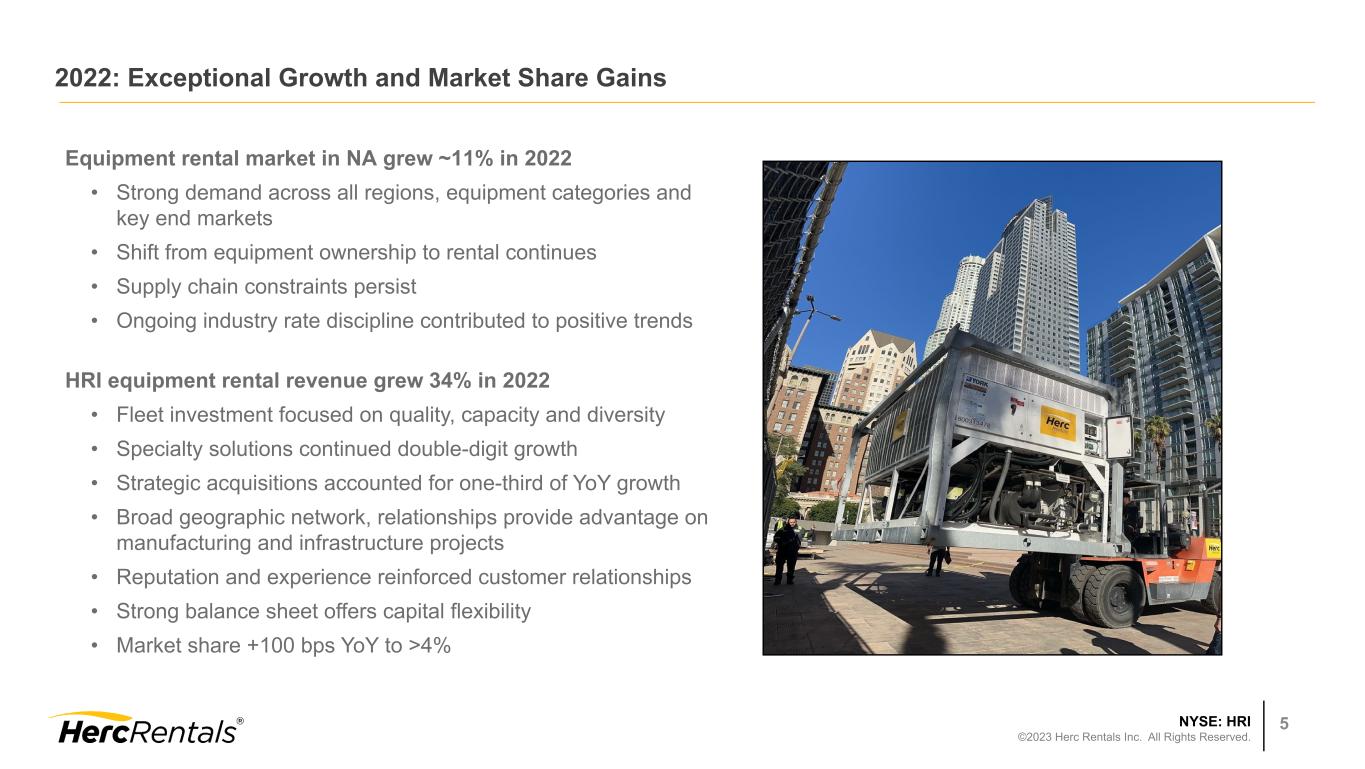 NYSE: HRI ©2023 Herc Rentals Inc. All Rights Reserved. 4 Rental Revenue $1,658 $1,702 $1,544 $1,910 $2,552 2018 2019 2020 2021 2022 Total Revenues $1,977 $1,999 $1,781 $2,073 $2,739 2018 2019 2020 2021 2022 2022: An Exceptional Year of Growth Adjusted EBITDA¹ $685 $741 $689 $895 $1,227 2018 2019 2020 2021 2022 34.6% 37.1% 38.7% 43.2% 44.8% 2018 2019 2020 2021 2022 $2.39 $1.63 $2.51 $7.37 $10.92 2018 2019 2020 2021 2022 +34% +37%+32% $ in millions $ in millions $ in millions +48% +160 bps Adjusted EBITDA Margin¹Earnings Per Diluted Share ROIC2 1. For a reconciliation to the most comparable GAAP financial measure, see the Appendix beginning on Slide 22 2. The company’s ROIC metric uses after-tax operating income for the trailing 12 months divided by average stockholders’ equity, debt and deferred taxes, net of average cash. To mitigate the volatility related to fluctuations in the company’s tax rate from period to period, the U.S. federal corporate statutory tax rate of 21% was used to calculate after-tax operating income. 5.4% 6.0% 5.2% 9.6% 10.8% 2018 2019 2020 2021 2022 +120 bps