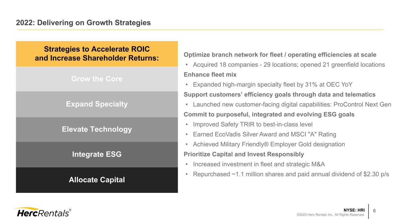 NYSE: HRI ©2023 Herc Rentals Inc. All Rights Reserved. 5 Equipment rental market in NA grew ~11% in 2022 • Strong demand across all regions, equipment categories and key end markets • Shift from equipment ownership to rental continues • Supply chain constraints persist • Ongoing industry rate discipline contributed to positive trends HRI equipment rental revenue grew 34% in 2022 • Fleet investment focused on quality, capacity and diversity • Specialty solutions continued double-digit growth • Strategic acquisitions accounted for one-third of YoY growth • Broad geographic network, relationships provide advantage on manufacturing and infrastructure projects • Reputation and experience reinforced customer relationships • Strong balance sheet offers capital flexibility • Market share +100 bps YoY to >4% 2022: Exceptional Growth and Market Share Gains