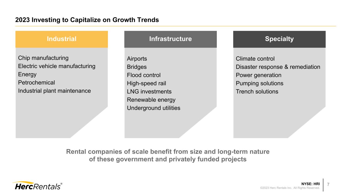NYSE: HRI ©2023 Herc Rentals Inc. All Rights Reserved. 6 Optimize branch network for fleet / operating efficiencies at scale • Acquired 18 companies - 29 locations; opened 21 greenfield locations Enhance fleet mix • Expanded high-margin specialty fleet by 31% at OEC YoY Support customers’ efficiency goals through data and telematics • Launched new customer-facing digital capabilities: ProControl Next Gen Commit to purposeful, integrated and evolving ESG goals • Improved Safety TRIR to best-in-class level • Earned EcoVadis Silver Award and MSCI "A" Rating • Achieved Military Friendly® Employer Gold designation Prioritize Capital and Invest Responsibly • Increased investment in fleet and strategic M&A • Repurchased ~1.1 million shares and paid annual dividend of $2.30 p/s 2022: Delivering on Growth Strategies Grow the Core Expand Specialty Elevate Technology Integrate ESG Allocate Capital Strategies to Accelerate ROIC and Increase Shareholder Returns: