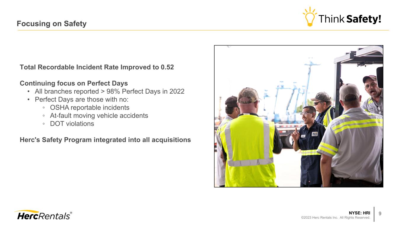 NYSE: HRI ©2023 Herc Rentals Inc. All Rights Reserved. 9 Focusing on Safety Total Recordable Incident Rate Improved to 0.52 Continuing focus on Perfect Days • All branches reported > 98% Perfect Days in 2022 • Perfect Days are those with no: ◦ OSHA reportable incidents ◦ At-fault moving vehicle accidents ◦ DOT violations Herc's Safety Program integrated into all acquisitions