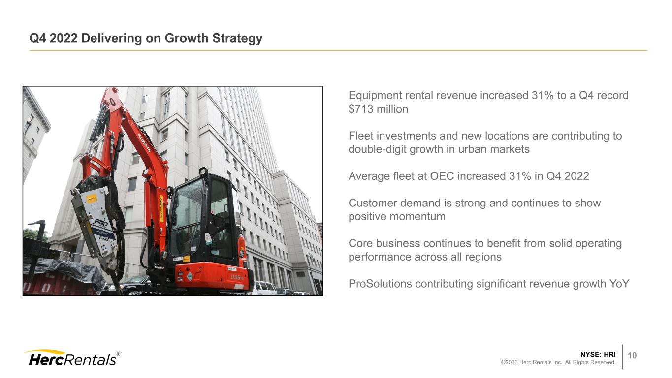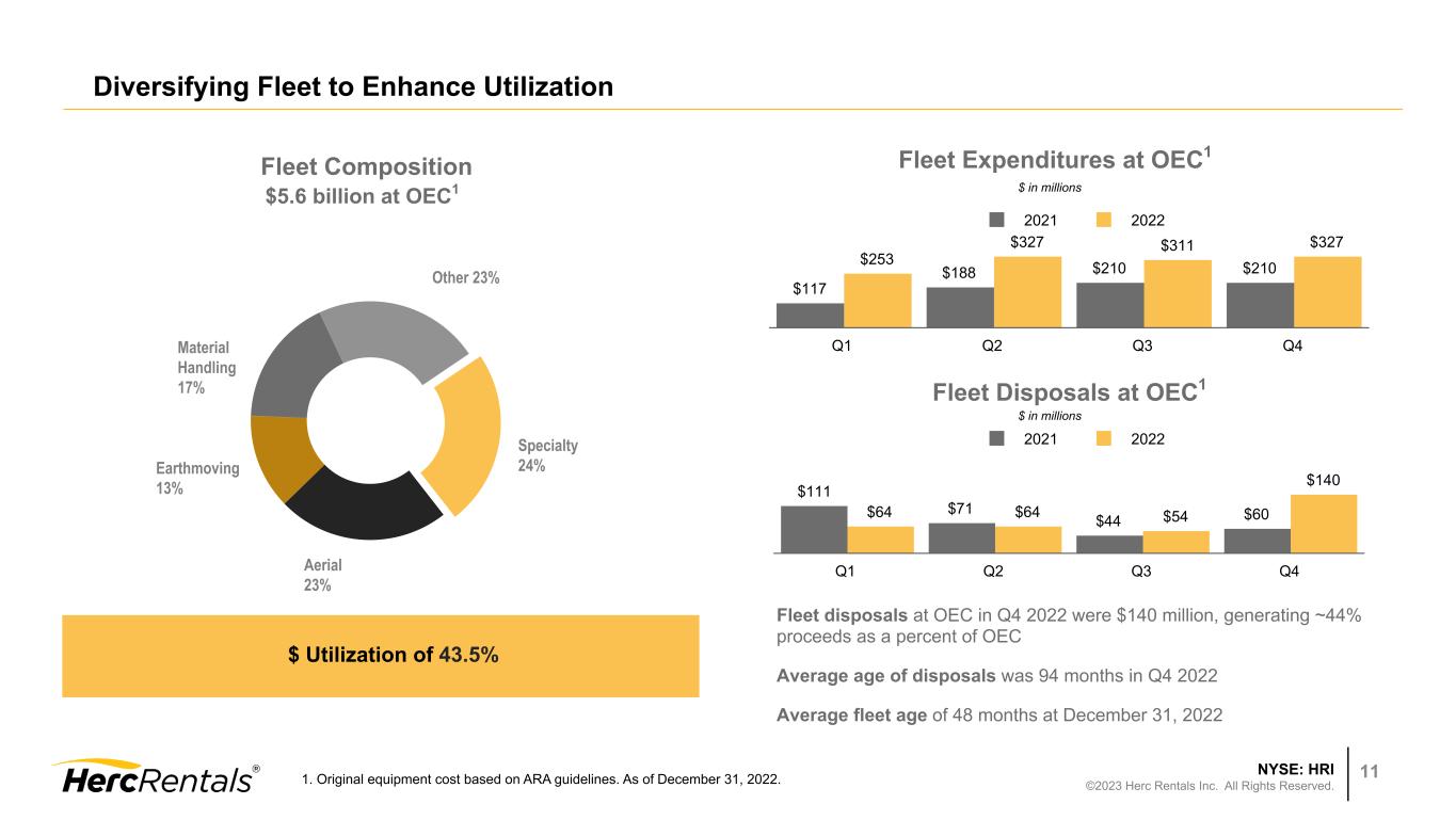 NYSE: HRI ©2023 Herc Rentals Inc. All Rights Reserved. 10 Equipment rental revenue increased 31% to a Q4 record $713 million Fleet investments and new locations are contributing to double-digit growth in urban markets Average fleet at OEC increased 31% in Q4 2022 Customer demand is strong and continues to show positive momentum Core business continues to benefit from solid operating performance across all regions ProSolutions contributing significant revenue growth YoY Q4 2022 Delivering on Growth Strategy