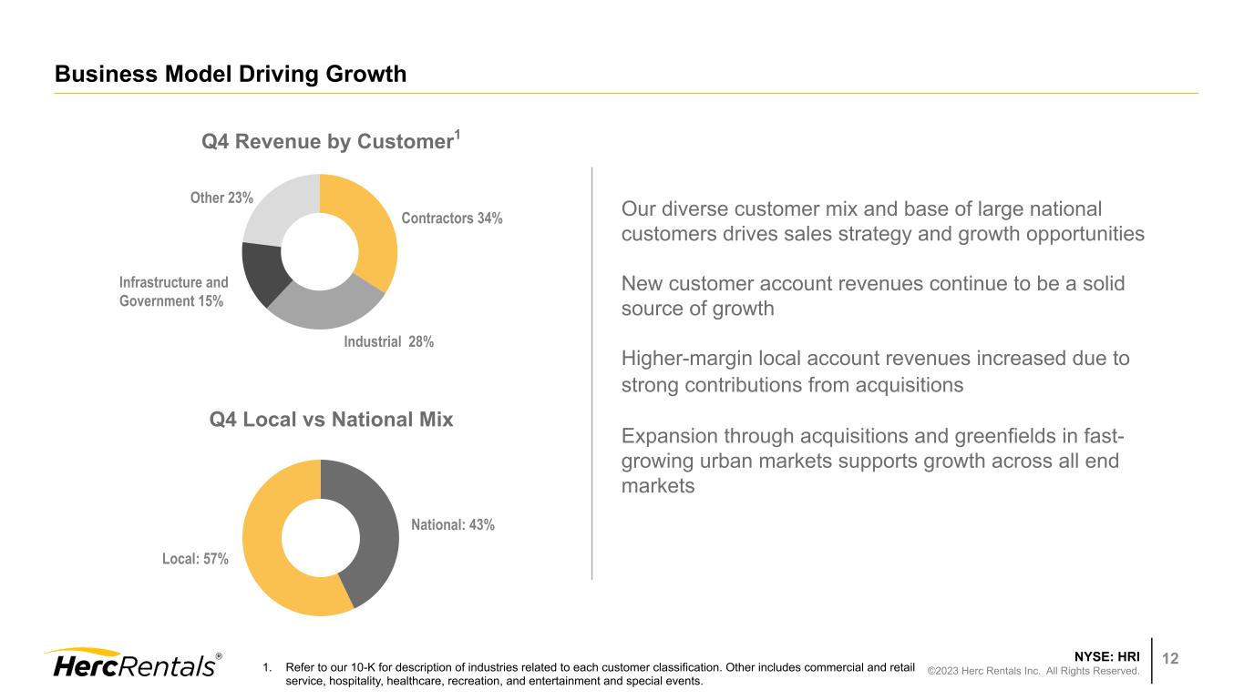 NYSE: HRI ©2023 Herc Rentals Inc. All Rights Reserved. 12 Business Model Driving Growth Q4 Revenue by Customer1 Contractors 34% Industrial 28% Infrastructure and Government 15% Other 23% National: 43% Local: 57% Q4 Local vs National Mix Our diverse customer mix and base of large national customers drives sales strategy and growth opportunities New customer account revenues continue to be a solid source of growth Higher-margin local account revenues increased due to strong contributions from acquisitions Expansion through acquisitions and greenfields in fast- growing urban markets supports growth across all end markets 1. Refer to our 10-K for description of industries related to each customer classification. Other includes commercial and retail service, hospitality, healthcare, recreation, and entertainment and special events.