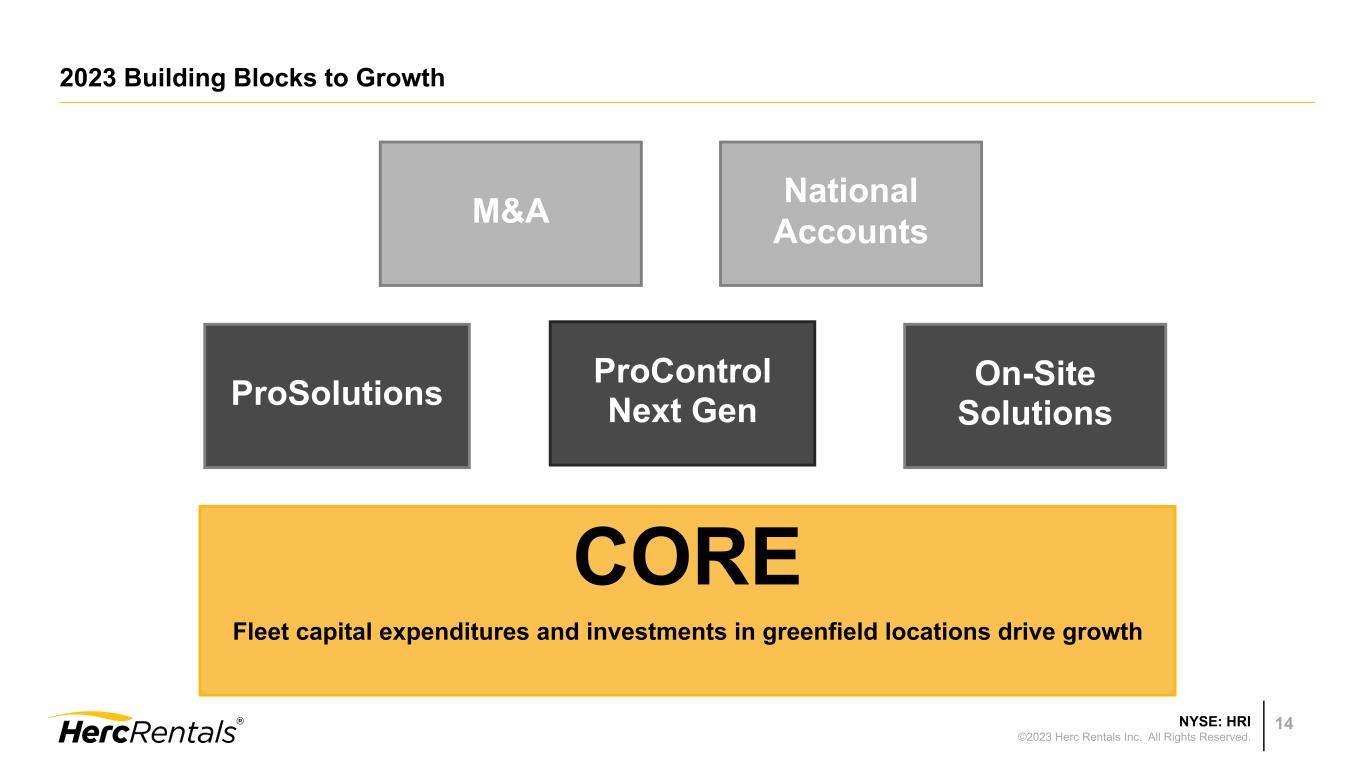 NYSE: HRI ©2023 Herc Rentals Inc. All Rights Reserved. 14 2023 Building Blocks to Growth CORE Fleet capital expenditures and investments in greenfield locations drive growth ProSolutions M&A ProControl Next Gen On-Site Solutions National Accounts