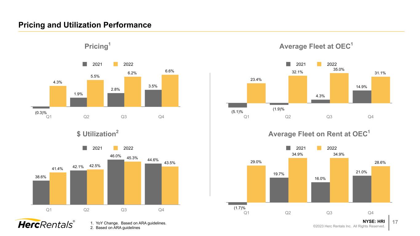 NYSE: HRI ©2023 Herc Rentals Inc. All Rights Reserved. 16 Q4 and 2022 Financial Results Three Months Ended December 31, Year Ended December 31, $ in millions, except per share data 2022 2021 2022 vs 2021 % Change 2022 2021 2022 vs 2021 % Change Equipment Rental Revenue $713 $542 31% $2,552 $1,910 34% Total Revenues $786 $578 36% $2,739 $2,073 32% Net Income $98 $72 36% $330 $224 47% Earnings Per Diluted Share $3.27 $2.36 39% $10.92 $7.37 48% Adjusted Net Income1 $103 $75 37% $340 $229 49% Adjusted Earnings Per Diluted Share1 $3.44 $2.46 40% $11.26 $7.52 50% Adjusted EBITDA1 $361 $257 41% $1,227 $895 37% Adjusted EBITDA Margin1 46.0% 44.4% 160 bps 44.8% 43.2% 160 bps REBITDA Margin1,2 47.3% 45.2% 210 bps 45.7% 44.8% 90 bps REBITDA YoY Flow-Through1,2 53.9% 48.1% Average Fleet3 (YoY) 31.1% 14.9% 30.5% 3.0% Pricing3 (YoY) 6.6% 3.5% 5.8% 2.1% ROIC 10.8% 9.6% 120 bps 1. For a reconciliation to the most comparable GAAP financial measure, see the Appendix beginning on Slide 22 2. REBITDA measures contribution from our core rental business without impact of sales of equipment, parts and supplies 3. Based on ARA guidelines
