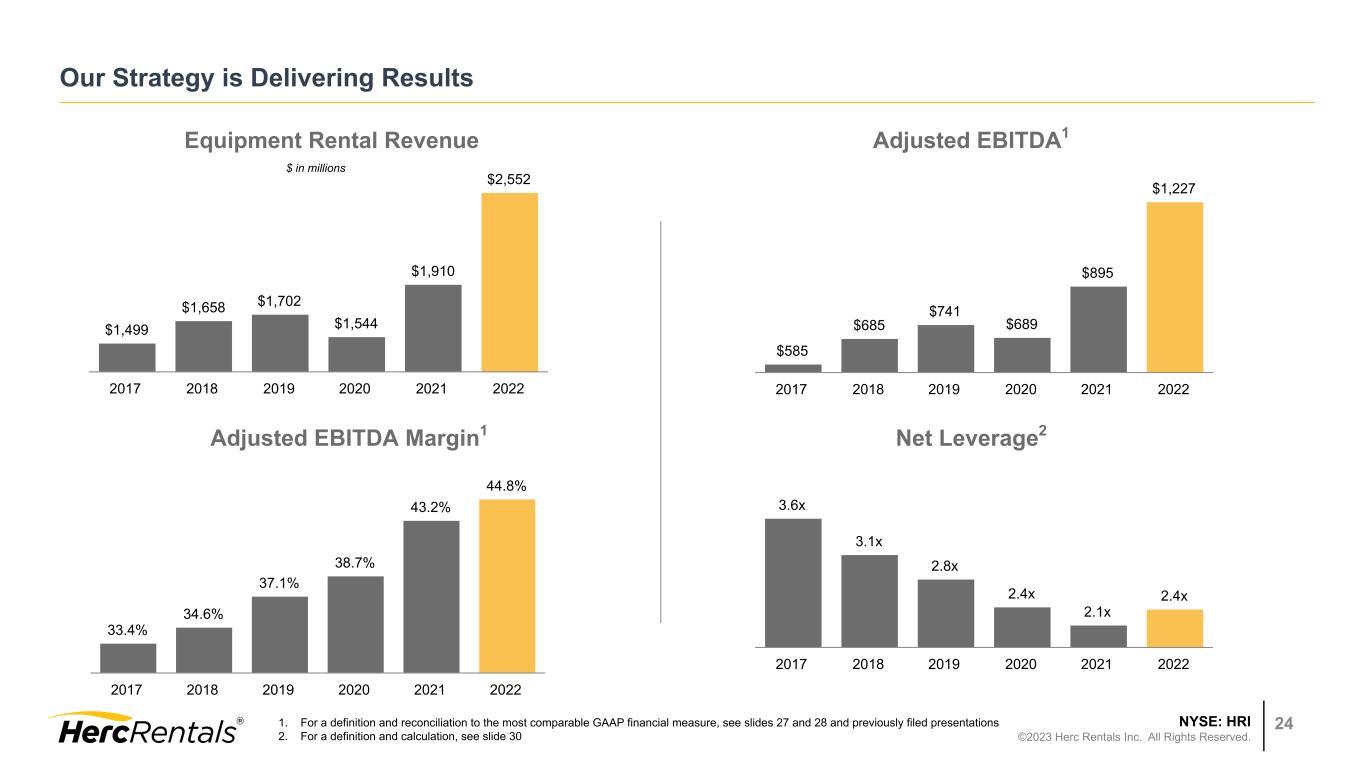 NYSE: HRI ©2023 Herc Rentals Inc. All Rights Reserved. 23 Glossary of Terms Commonly Used in the Industry OEC: Original Equipment Cost which is an operating measure based on the guidelines of the American Rental Association (ARA), which is calculated as the cost of the asset at the time it was first purchased plus additional capitalized refurbishment costs (with the basis of refurbished assets reset at the refurbishment date). Fleet Age: The OEC weighted age of the entire fleet, based on ARA guidelines. Net Fleet Capital Expenditures: Capital expenditures of rental equipment minus the proceeds from disposal of rental equipment. Dollar Utilization ($ UT): Dollar utilization is an operating measure calculated by dividing equipment rental revenue (excluding re-rent, delivery, pick-up and other ancillary revenue) by the average OEC of the equipment fleet for the relevant time period, based on ARA guidelines. Pricing: Change in pure pricing achieved in one period versus another period. This is applied both to year-over-year and sequential comparisons. Rental rates are based on ARA guidelines and are calculated based on the category class rate variance achieved either year-over-year or sequentially for any fleet that qualifies for the fleet base and weighted by the prior year revenue mix.