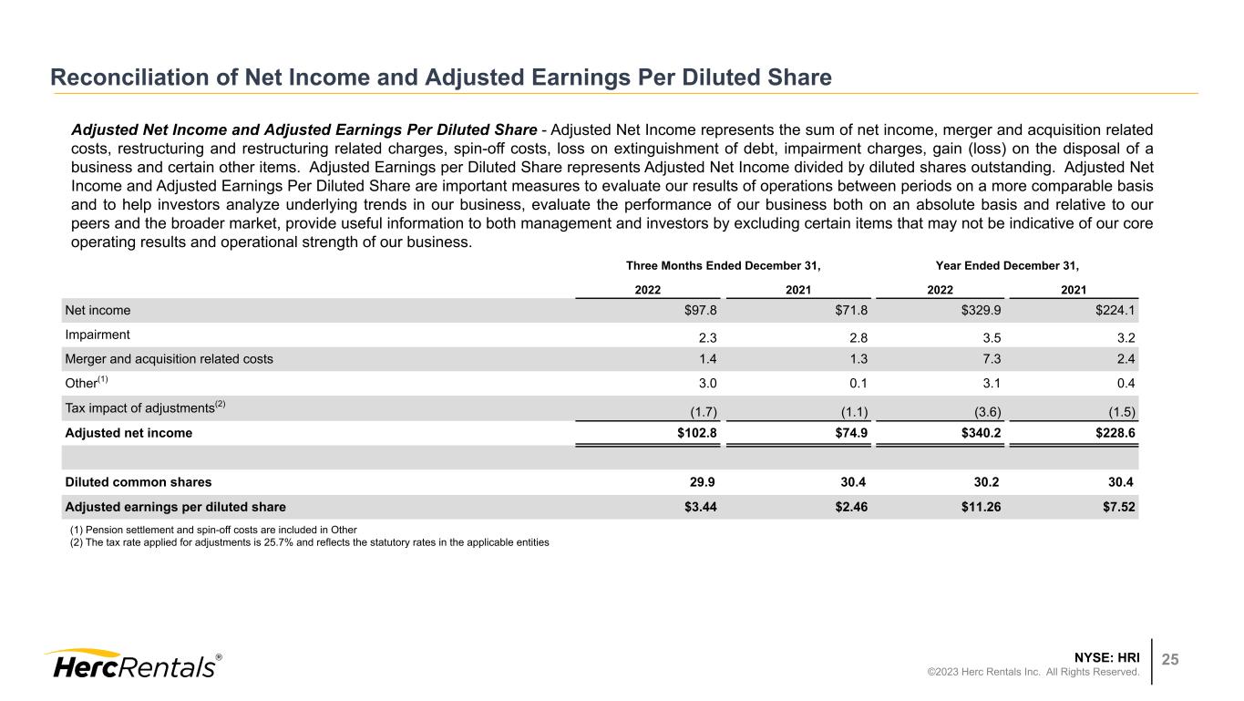 NYSE: HRI ©2023 Herc Rentals Inc. All Rights Reserved. 25 Reconciliation of Net Income and Adjusted Earnings Per Diluted Share Adjusted Net Income and Adjusted Earnings Per Diluted Share - Adjusted Net Income represents the sum of net income, merger and acquisition related costs, restructuring and restructuring related charges, spin-off costs, loss on extinguishment of debt, impairment charges, gain (loss) on the disposal of a business and certain other items. Adjusted Earnings per Diluted Share represents Adjusted Net Income divided by diluted shares outstanding. Adjusted Net Income and Adjusted Earnings Per Diluted Share are important measures to evaluate our results of operations between periods on a more comparable basis and to help investors analyze underlying trends in our business, evaluate the performance of our business both on an absolute basis and relative to our peers and the broader market, provide useful information to both management and investors by excluding certain items that may not be indicative of our core operating results and operational strength of our business. (1) Pension settlement and spin-off costs are included in Other (2) The tax rate applied for adjustments is 25.7% and reflects the statutory rates in the applicable entities Three Months Ended December 31, Year Ended December 31, 2022 2021 2022 2021 Net income $97.8 $71.8 $329.9 $224.1 Impairment 2.3 2.8 3.5 3.2 Merger and acquisition related costs 1.4 1.3 7.3 2.4 Other(1) 3.0 0.1 3.1 0.4 Tax impact of adjustments(2) (1.7) (1.1) (3.6) (1.5) Adjusted net income $102.8 $74.9 $340.2 $228.6 Diluted common shares 29.9 30.4 30.2 30.4 Adjusted earnings per diluted share $3.44 $2.46 $11.26 $7.52
