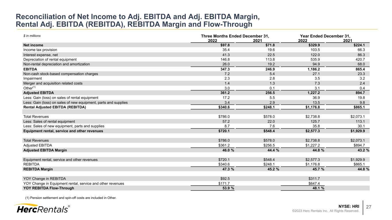 NYSE: HRI ©2023 Herc Rentals Inc. All Rights Reserved. 26 Reconciliation of Net Income to Adj. EBITDA and Adj. EBITDA Margin, Rental Adj. EBITDA (REBITDA), REBITDA Margin and Flow-Through EBITDA, Adjusted EBITDA, and REBITDA - EBITDA represents the sum of net income, provision (benefit) for income taxes, interest expense, net, depreciation of rental equipment and non-rental depreciation and amortization. Adjusted EBITDA represents EBITDA plus the sum of merger and acquisition related costs, restructuring and restructuring related charges, spin-off costs, non-cash stock based compensation charges, loss on extinguishment of debt (which is included in interest expense, net), impairment charges, gain (loss) on disposal of a business and certain other items. REBITDA represents Adjusted EBITDA excluding the gain (loss) on sales of rental equipment and new equipment, parts and supplies. EBITDA, Adjusted EBITDA and REBITDA do not purport to be alternatives to net income as an indicator of operating performance. Additionally, none of these measures purports to be an alternative to cash flows from operating activities as a measure of liquidity, as they do not consider certain cash requirements such as interest payments and tax payments. Adjusted EBITDA Margin, REBITDA Margin and REBITDA Flow-Through - Adjusted EBITDA Margin (Adjusted EBITDA / Total Revenues) is a commonly used profitability ratio. REBITDA Margin (REBITDA / Equipment rental, service and other revenues) and REBITDA Flow- Through (the year-over-year change in REBITDA/the year-over-year change in Equipment rental, service, and other revenues) are useful operating profitability ratios to management and investors.