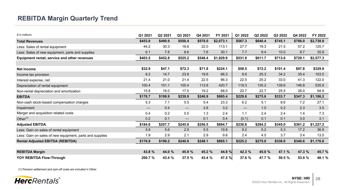 NYSE: HRI ©2023 Herc Rentals Inc. All Rights Reserved. 27 Reconciliation of Net Income to Adj. EBITDA and Adj. EBITDA Margin, Rental Adj. EBITDA (REBITDA), REBITDA Margin and Flow-Through $ in millions Three Months Ended December 31, Year Ended December 31, 2022 2021 2022 2021 Net income $97.8 $71.8 $329.9 $224.1 Income tax provision 35.4 19.6 103.5 66.3 Interest expense, net 41.3 22.5 122.0 86.3 Depreciation of rental equipment 146.8 113.8 535.9 420.7 Non-rental depreciation and amortization 26.0 19.2 94.9 68.0 EBITDA 347.3 246.9 1,186.2 865.4 Non-cash stock-based compensation charges 7.2 5.4 27.1 23.3 Impairment 2.3 2.8 3.5 3.2 Merger and acquisition related costs 1.4 1.3 7.3 2.4 Other(1) 3.0 0.1 3.1 0.4 Adjusted EBITDA 361.2 256.5 1,227.2 894.7 Less: Gain (loss) on sales of rental equipment 17.2 5.5 36.9 19.8 Less: Gain (loss) on sales of new equipment, parts and supplies 3.4 2.9 13.5 9.8 Rental Adjusted EBITDA (REBITDA) $340.6 $248.1 $1,176.8 $865.1 Total Revenues $786.0 $578.0 $2,738.8 $2,073.1 Less: Sales of rental equipment 57.2 22.0 125.7 113.1 Less: Sales of new equipment, parts and supplies 8.7 7.6 35.8 30.1 Equipment rental, service and other revenues $720.1 $548.4 $2,577.3 $1,929.9 Total Revenues $786.0 $578.0 $2,738.8 $2,073.1 Adjusted EBITDA $361.2 $256.5 $1,227.2 $894.7 Adjusted EBITDA Margin 46.0 % 44.4 % 44.8 % 43.2 % Equipment rental, service and other revenues $720.1 $548.4 $2,577.3 $1,929.9 REBITDA $340.6 $248.1 $1,176.8 $865.1 REBITDA Margin 47.3 % 45.2 % 45.7 % 44.8 % YOY Change in REBITDA $92.5 $311.7 YOY Change in Equipment rental, service and other revenues $171.7 $647.4 YOY REBITDA Flow-Through 53.9 % 48.1 % (1) Pension settlement and spin-off costs are included in Other.