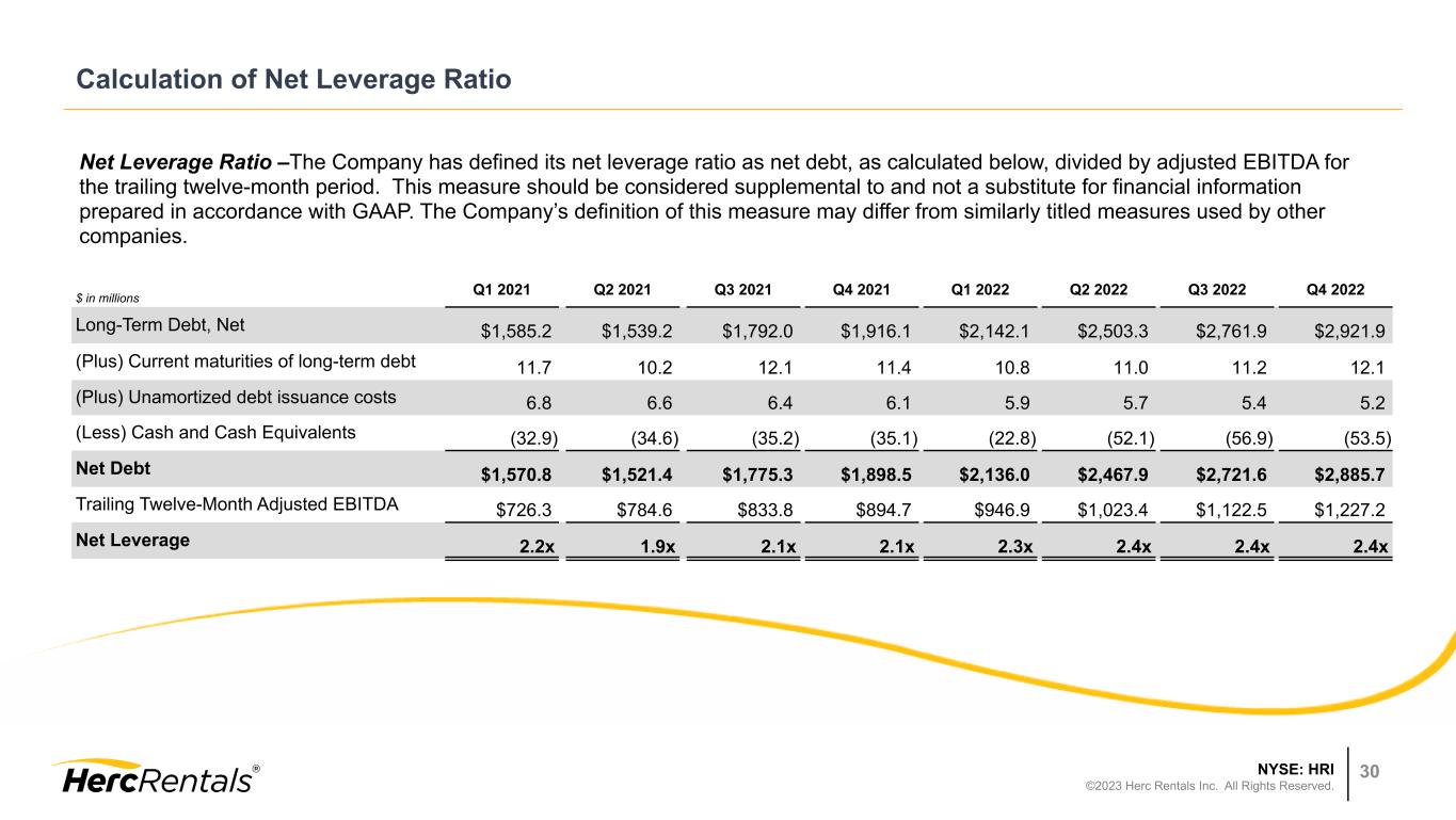 NYSE: HRI ©2023 Herc Rentals Inc. All Rights Reserved. 30 Calculation of Net Leverage Ratio Net Leverage Ratio –The Company has defined its net leverage ratio as net debt, as calculated below, divided by adjusted EBITDA for the trailing twelve-month period. This measure should be considered supplemental to and not a substitute for financial information prepared in accordance with GAAP. The Company’s definition of this measure may differ from similarly titled measures used by other companies. $ in millions Q1 2021 Q2 2021 Q3 2021 Q4 2021 Q1 2022 Q2 2022 Q3 2022 Q4 2022 Long-Term Debt, Net $1,585.2 $1,539.2 $1,792.0 $1,916.1 $2,142.1 $2,503.3 $2,761.9 $2,921.9 (Plus) Current maturities of long-term debt 11.7 10.2 12.1 11.4 10.8 11.0 11.2 12.1 (Plus) Unamortized debt issuance costs 6.8 6.6 6.4 6.1 5.9 5.7 5.4 5.2 (Less) Cash and Cash Equivalents (32.9) (34.6) (35.2) (35.1) (22.8) (52.1) (56.9) (53.5) Net Debt $1,570.8 $1,521.4 $1,775.3 $1,898.5 $2,136.0 $2,467.9 $2,721.6 $2,885.7 Trailing Twelve-Month Adjusted EBITDA $726.3 $784.6 $833.8 $894.7 $946.9 $1,023.4 $1,122.5 $1,227.2 Net Leverage 2.2x 1.9x 2.1x 2.1x 2.3x 2.4x 2.4x 2.4x