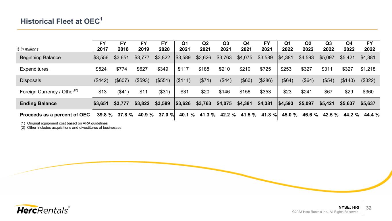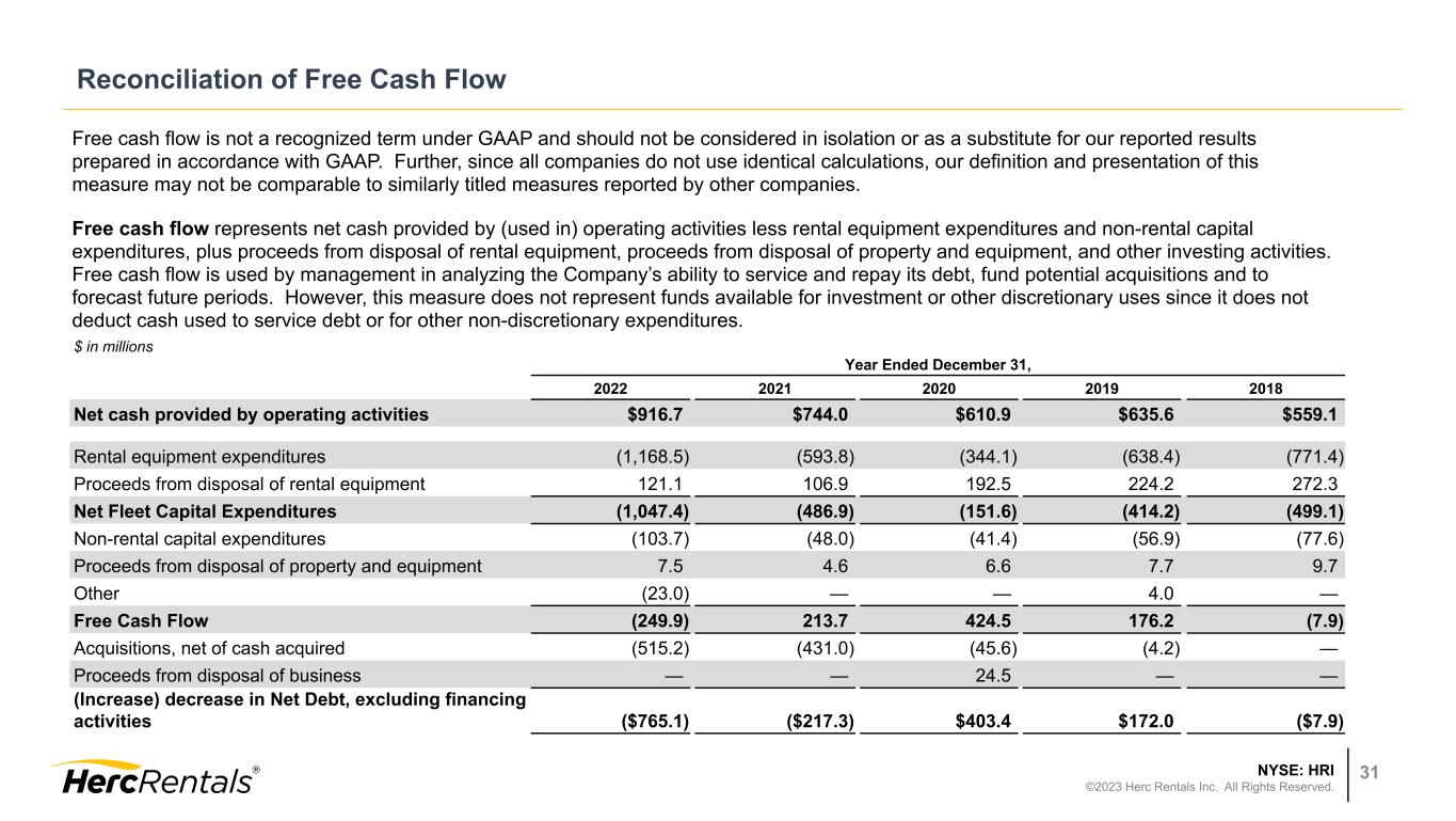 NYSE: HRI ©2023 Herc Rentals Inc. All Rights Reserved. 31 Reconciliation of Free Cash Flow Free cash flow is not a recognized term under GAAP and should not be considered in isolation or as a substitute for our reported results prepared in accordance with GAAP. Further, since all companies do not use identical calculations, our definition and presentation of this measure may not be comparable to similarly titled measures reported by other companies. Free cash flow represents net cash provided by (used in) operating activities less rental equipment expenditures and non-rental capital expenditures, plus proceeds from disposal of rental equipment, proceeds from disposal of property and equipment, and other investing activities. Free cash flow is used by management in analyzing the Company’s ability to service and repay its debt, fund potential acquisitions and to forecast future periods. However, this measure does not represent funds available for investment or other discretionary uses since it does not deduct cash used to service debt or for other non-discretionary expenditures. $ in millions Year Ended December 31, 2022 2021 2020 2019 2018 Net cash provided by operating activities $916.7 $744.0 $610.9 $635.6 $559.1 Rental equipment expenditures (1,168.5) (593.8) (344.1) (638.4) (771.4) Proceeds from disposal of rental equipment 121.1 106.9 192.5 224.2 272.3 Net Fleet Capital Expenditures (1,047.4) (486.9) (151.6) (414.2) (499.1) Non-rental capital expenditures (103.7) (48.0) (41.4) (56.9) (77.6) Proceeds from disposal of property and equipment 7.5 4.6 6.6 7.7 9.7 Other (23.0) — — 4.0 — Free Cash Flow (249.9) 213.7 424.5 176.2 (7.9) Acquisitions, net of cash acquired (515.2) (431.0) (45.6) (4.2) — Proceeds from disposal of business — — 24.5 — — (Increase) decrease in Net Debt, excluding financing activities ($765.1) ($217.3) $403.4 $172.0 ($7.9)