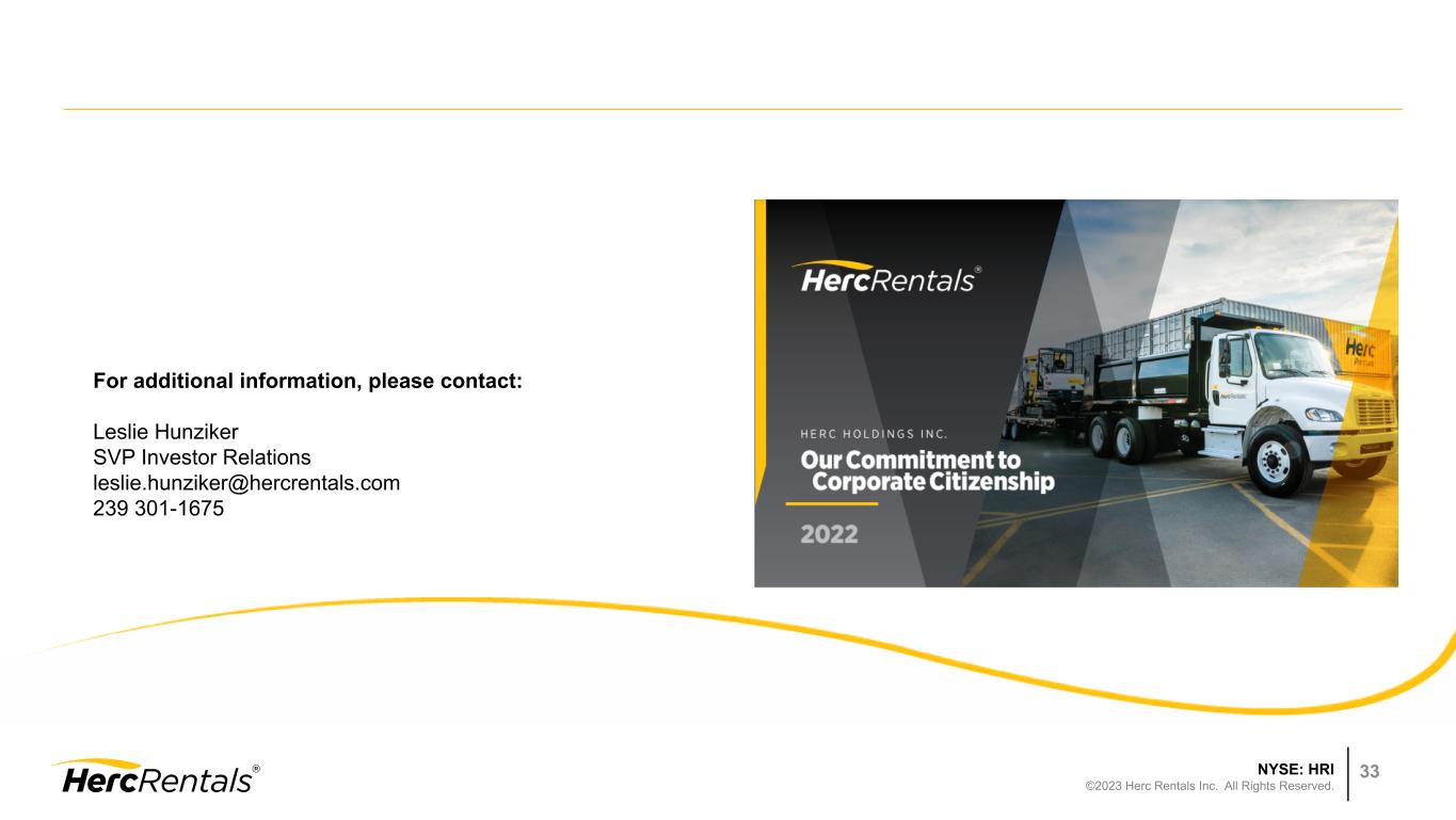 NYSE: HRI ©2023 Herc Rentals Inc. All Rights Reserved. 33 For additional information, please contact: Leslie Hunziker SVP Investor Relations leslie.hunziker@hercrentals.com 239 301-1675