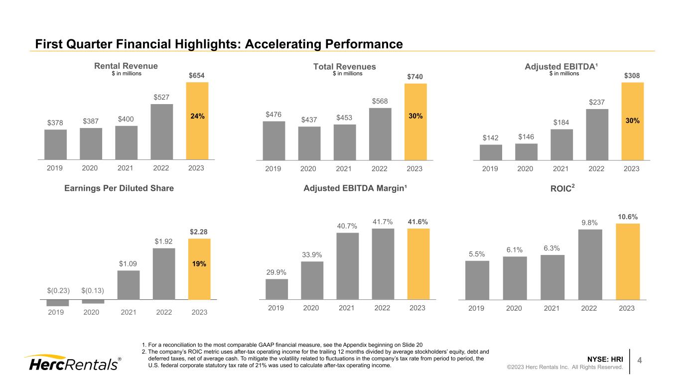 NYSE: HRI ©2023 Herc Rentals Inc. All Rights Reserved. 3 Safe Harbor Statements and Non-GAAP Financial Measures Forward-Looking Statements This presentation includes forward-looking statements as that term is defined by the federal securities laws, including statements concerning our business plans and strategy, projected profitability, performance or cash flows, future capital expenditures, our growth strategy, including our ability to grow organically and through M&A, anticipated financing needs, business trends, our capital allocation strategy, liquidity and capital management, and other information that is not historical information. Forward looking statements are generally identified by the words "estimates," "expects," "anticipates," "projects," "plans," "intends," "believes," "forecasts," "looks," and future or conditional verbs, such as "will," "should," "could" or "may," as well as variations of such words or similar expressions. All forward- looking statements are based upon our current expectations and various assumptions and, there can be no assurance that our current expectations will be achieved. They are subject to future events, risks and uncertainties - many of which are beyond our control - as well as potentially inaccurate assumptions, that could cause actual results to differ materially from those in the forward-looking statements. Further information on the risks that may affect our business is included in filings we make with the Securities and Exchange Commission from time to time, including our most recent annual report on Form 10-K, subsequent quarterly reports on Form 10-Q, and in our other SEC filings. We undertake no obligation to update or revise forward-looking statements that have been made to reflect events or circumstances that arise after the date made or to reflect the occurrence of unanticipated events. Information Regarding Non-GAAP Financial Measures In addition to results calculated according to accounting principles generally accepted in the United States (“GAAP”), the Company has provided certain information in this presentation that is not calculated according to GAAP (“non- GAAP”), such as adjusted net income, adjusted earnings per diluted share, EBITDA, adjusted EBITDA, adjusted EBITDA margin, REBITDA, REBITDA margin, REBITDA flow-through and free cash flow. Management uses these non-GAAP measures to evaluate operating performance and period-over-period performance of our core business without regard to potential distortions, and believes that investors will likewise find these non-GAAP measures useful in evaluating the Company’s performance. These measures are frequently used by security analysts, institutional investors and other interested parties in the evaluation of companies in our industry. Non-GAAP measures should not be considered in isolation or as a substitute for our reported results prepared in accordance with GAAP and, as calculated, may not be comparable to similarly titled measures of other companies. For the definitions of these terms, further information about management’s use of these measures as well as a reconciliation of these non-GAAP measures to the most comparable GAAP financial measures, please see the appendix that accompanies this presentation.
