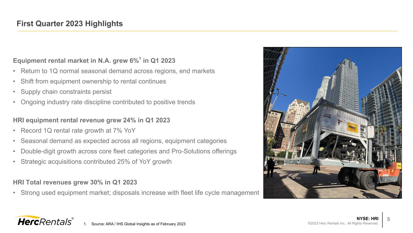 NYSE: HRI ©2023 Herc Rentals Inc. All Rights Reserved. 4 Rental Revenue $378 $387 $400 $527 $654 2019 2020 2021 2022 2023 Total Revenues $476 $437 $453 $568 $740 2019 2020 2021 2022 2023 Adjusted EBITDA¹ $142 $146 $184 $237 $308 2019 2020 2021 2022 2023 29.9% 33.9% 40.7% 41.7% 41.6% 2019 2020 2021 2022 2023 $1.09 $1.92 $2.28 24% 30%30% $ in millions $ in millions $ in millions 19% Adjusted EBITDA Margin¹Earnings Per Diluted Share ROIC2 1. For a reconciliation to the most comparable GAAP financial measure, see the Appendix beginning on Slide 20 2. The company’s ROIC metric uses after-tax operating income for the trailing 12 months divided by average stockholders’ equity, debt and deferred taxes, net of average cash. To mitigate the volatility related to fluctuations in the company’s tax rate from period to period, the U.S. federal corporate statutory tax rate of 21% was used to calculate after-tax operating income. 5.5% 6.1% 6.3% 9.8% 10.6% 2019 2020 2021 2022 2023 First Quarter Financial Highlights: Accelerating Performance $(0.23) $(0.13) 2019 2020 2021 2022 2023