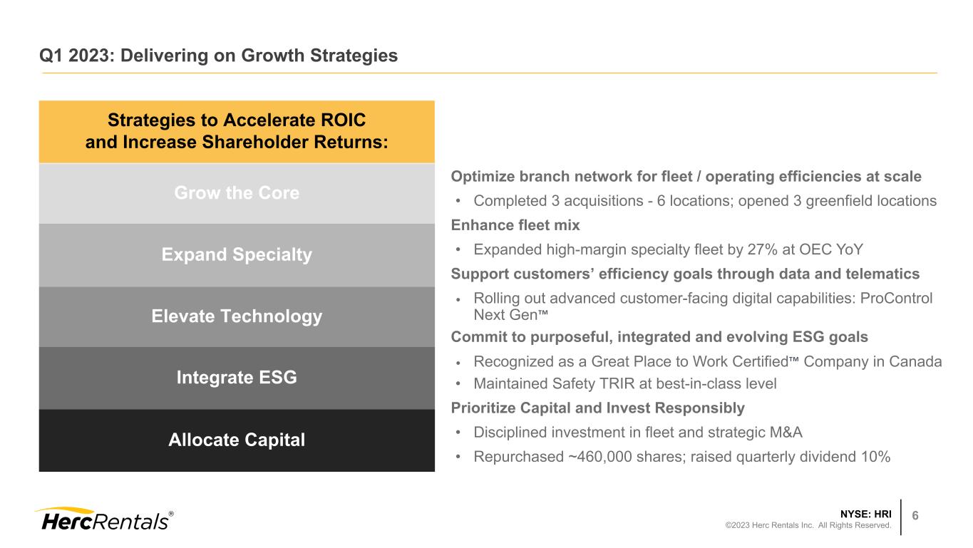 NYSE: HRI ©2023 Herc Rentals Inc. All Rights Reserved. 5 Equipment rental market in N.A. grew 6%1 in Q1 2023 • Return to 1Q normal seasonal demand across regions, end markets • Shift from equipment ownership to rental continues • Supply chain constraints persist • Ongoing industry rate discipline contributed to positive trends HRI equipment rental revenue grew 24% in Q1 2023 • Record 1Q rental rate growth at 7% YoY • Seasonal demand as expected across all regions, equipment categories • Double-digit growth across core fleet categories and Pro-Solutions offerings • Strategic acquisitions contributed 25% of YoY growth HRI Total revenues grew 30% in Q1 2023 • Strong used equipment market; disposals increase with fleet life cycle management First Quarter 2023 Highlights 1. Source: ARA / IHS Global Insights as of February 2023