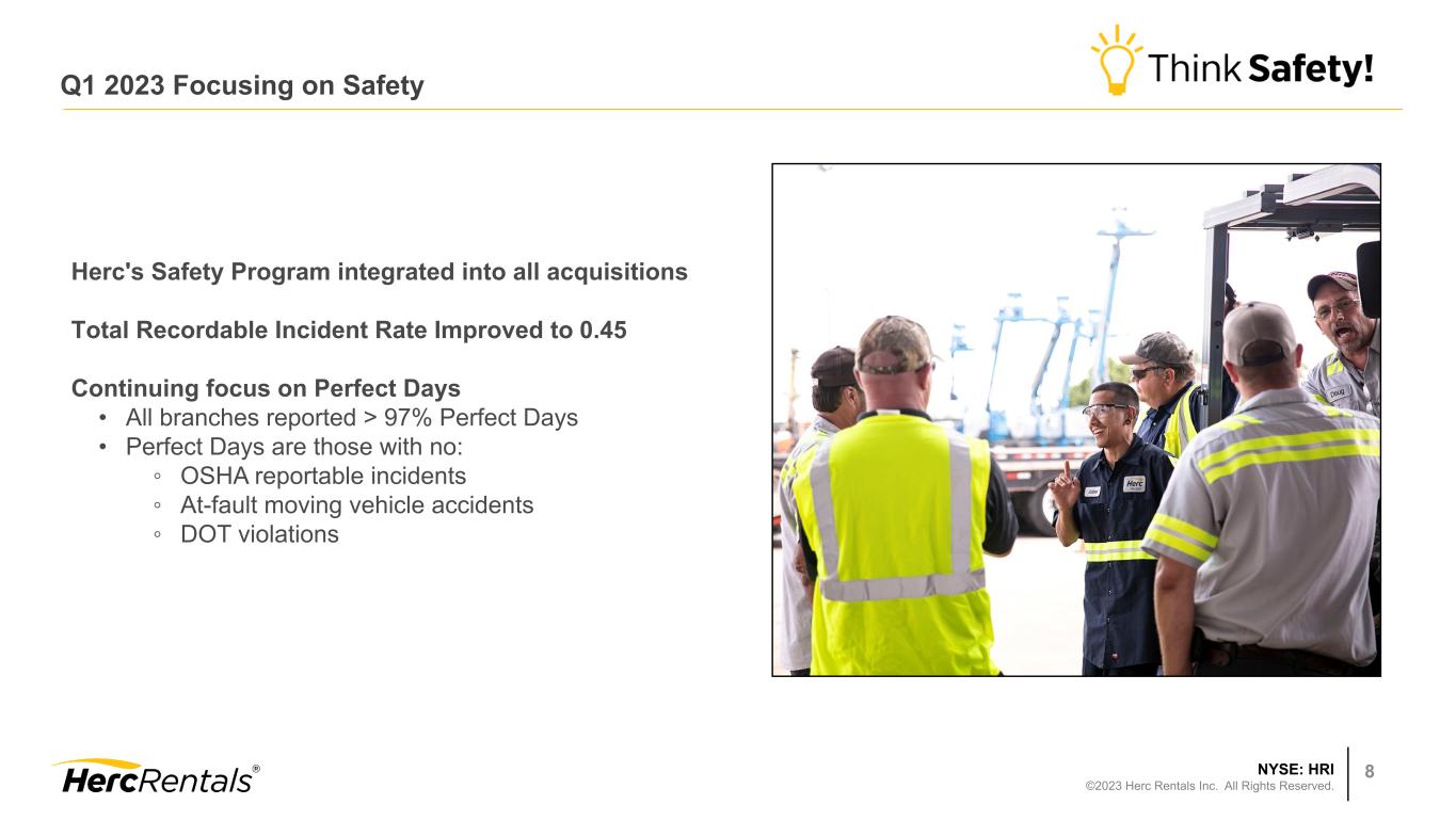 NYSE: HRI ©2023 Herc Rentals Inc. All Rights Reserved. 6 Optimize branch network for fleet / operating efficiencies at scale • Completed 3 acquisitions - 6 locations; opened 3 greenfield locations Enhance fleet mix • Expanded high-margin specialty fleet by 27% at OEC YoY Support customers’ efficiency goals through data and telematics • Rolling out advanced customer-facing digital capabilities: ProControl Next Gen™ Commit to purposeful, integrated and evolving ESG goals • Recognized as a Great Place to Work Certified™ Company in Canada • Maintained Safety TRIR at best-in-class level Prioritize Capital and Invest Responsibly • Disciplined investment in fleet and strategic M&A • Repurchased ~460,000 shares; raised quarterly dividend 10% Q1 2023: Delivering on Growth Strategies Grow the Core Expand Specialty Elevate Technology Integrate ESG Allocate Capital Strategies to Accelerate ROIC and Increase Shareholder Returns: