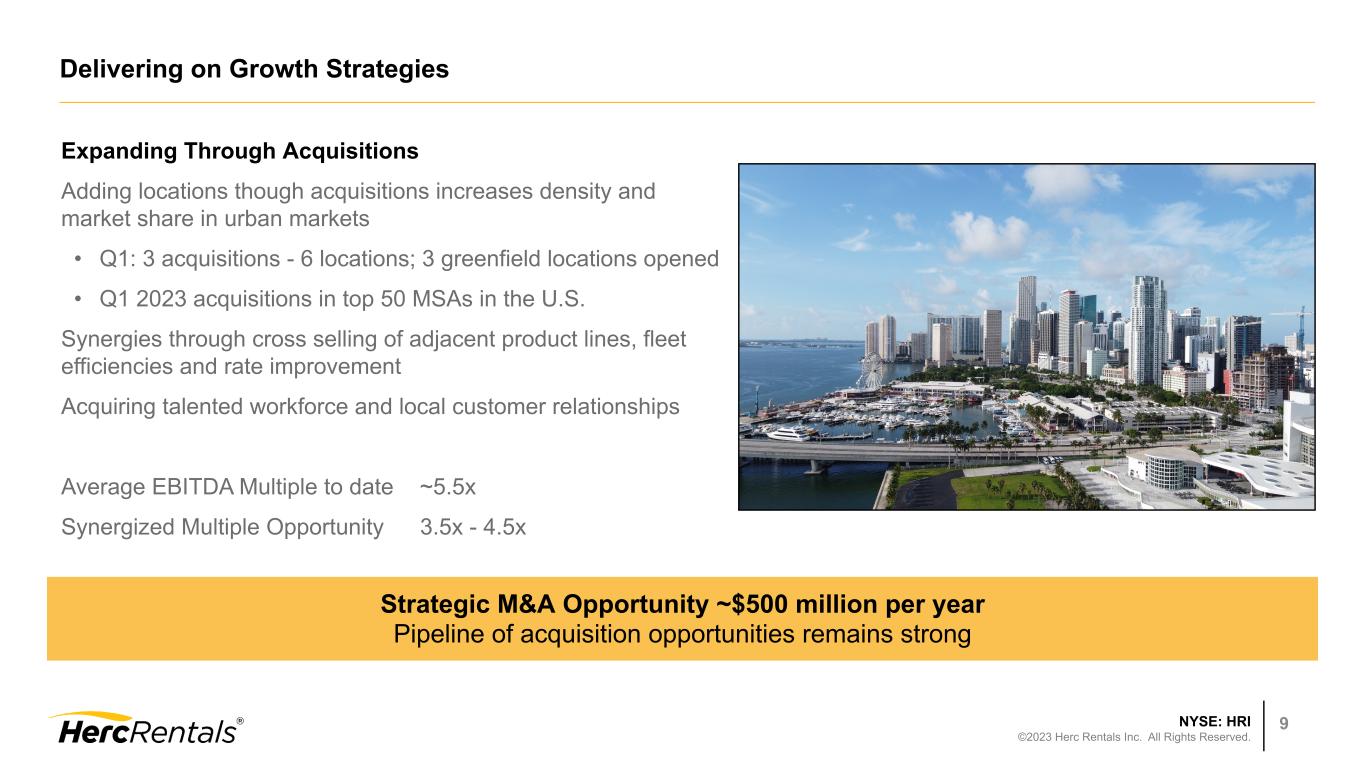 NYSE: HRI ©2023 Herc Rentals Inc. All Rights Reserved. 8 Q1 2023 Focusing on Safety Herc's Safety Program integrated into all acquisitions Total Recordable Incident Rate Improved to 0.45 Continuing focus on Perfect Days • All branches reported > 97% Perfect Days • Perfect Days are those with no: ◦ OSHA reportable incidents ◦ At-fault moving vehicle accidents ◦ DOT violations