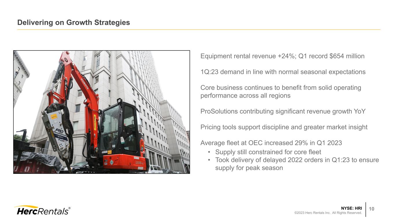 NYSE: HRI ©2023 Herc Rentals Inc. All Rights Reserved. 9 Delivering on Growth Strategies Expanding Through Acquisitions Adding locations though acquisitions increases density and market share in urban markets • Q1: 3 acquisitions - 6 locations; 3 greenfield locations opened • Q1 2023 acquisitions in top 50 MSAs in the U.S. Synergies through cross selling of adjacent product lines, fleet efficiencies and rate improvement Acquiring talented workforce and local customer relationships Average EBITDA Multiple to date ~5.5x Synergized Multiple Opportunity 3.5x - 4.5x Strategic M&A Opportunity ~$500 million per year Pipeline of acquisition opportunities remains strong