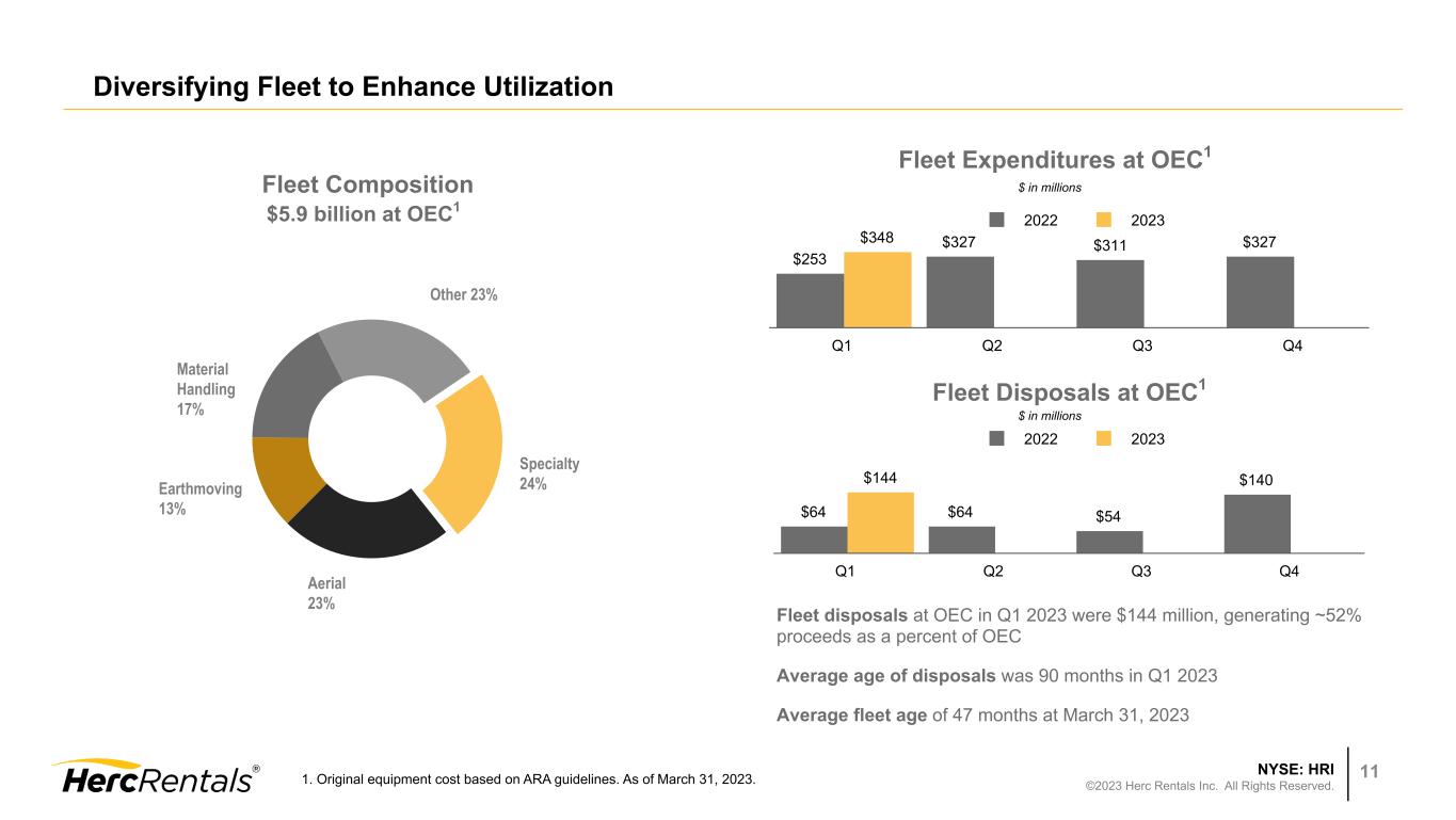 NYSE: HRI ©2023 Herc Rentals Inc. All Rights Reserved. 10 Equipment rental revenue +24%; Q1 record $654 million 1Q:23 demand in line with normal seasonal expectations Core business continues to benefit from solid operating performance across all regions ProSolutions contributing significant revenue growth YoY Pricing tools support discipline and greater market insight Average fleet at OEC increased 29% in Q1 2023 • Supply still constrained for core fleet • Took delivery of delayed 2022 orders in Q1:23 to ensure supply for peak season Delivering on Growth Strategies