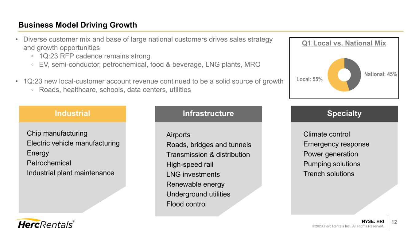 NYSE: HRI ©2023 Herc Rentals Inc. All Rights Reserved. 11 Diversifying Fleet to Enhance Utilization Specialty 24% Aerial 23% Earthmoving 13% Material Handling 17% Other 23% 1. Original equipment cost based on ARA guidelines. As of March 31, 2023. Fleet Expenditures at OEC1 Fleet Composition $5.9 billion at OEC1 $253 $327 $311 $327$348 2022 2023 Q1 Q2 Q3 Q4 $64 $64 $54 $140$144 2022 2023 Q1 Q2 Q3 Q4 Fleet Disposals at OEC1 $ in millions $ in millions Fleet disposals at OEC in Q1 2023 were $144 million, generating ~52% proceeds as a percent of OEC Average age of disposals was 90 months in Q1 2023 Average fleet age of 47 months at March 31, 2023