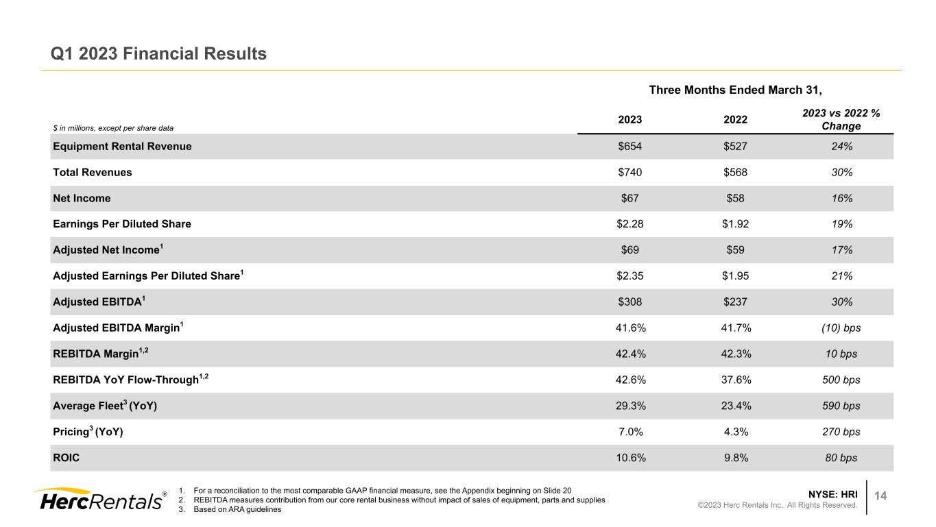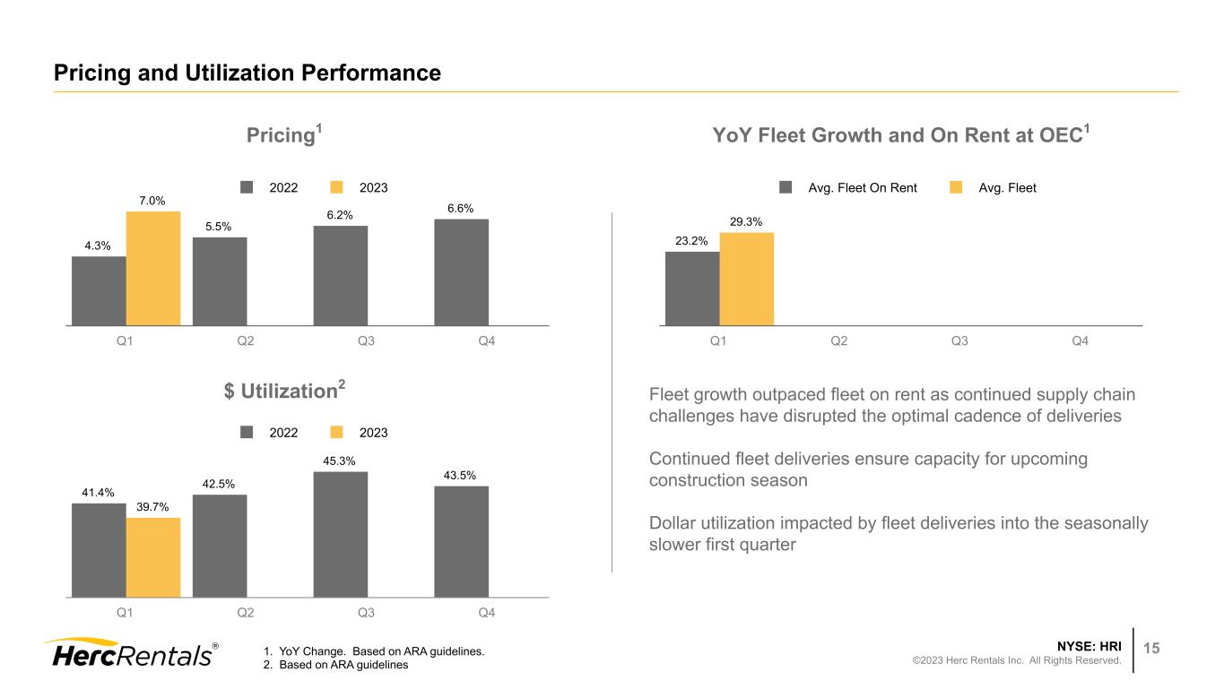 NYSE: HRI ©2023 Herc Rentals Inc. All Rights Reserved. 14 Q1 2023 Financial Results Three Months Ended March 31, $ in millions, except per share data 2023 2022 2023 vs 2022 % Change Equipment Rental Revenue $654 $527 24% Total Revenues $740 $568 30% Net Income $67 $58 16% Earnings Per Diluted Share $2.28 $1.92 19% Adjusted Net Income1 $69 $59 17% Adjusted Earnings Per Diluted Share1 $2.35 $1.95 21% Adjusted EBITDA1 $308 $237 30% Adjusted EBITDA Margin1 41.6% 41.7% (10) bps REBITDA Margin1,2 42.4% 42.3% 10 bps REBITDA YoY Flow-Through1,2 42.6% 37.6% 500 bps Average Fleet3 (YoY) 29.3% 23.4% 590 bps Pricing3 (YoY) 7.0% 4.3% 270 bps ROIC 10.6% 9.8% 80 bps 1. For a reconciliation to the most comparable GAAP financial measure, see the Appendix beginning on Slide 20 2. REBITDA measures contribution from our core rental business without impact of sales of equipment, parts and supplies 3. Based on ARA guidelines