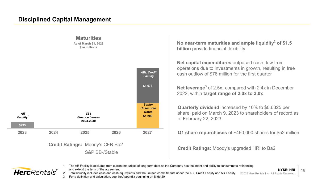 NYSE: HRI ©2023 Herc Rentals Inc. All Rights Reserved. 15 Pricing and Utilization Performance Pricing1 4.3% 5.5% 6.2% 6.6% 7.0% 2022 2023 Q1 Q2 Q3 Q4 YoY Fleet Growth and On Rent at OEC1 23.2% 29.3% Avg. Fleet On Rent Avg. Fleet Q1 Q2 Q3 Q4 $ Utilization2 41.4% 42.5% 45.3% 43.5% 39.7% 2022 2023 Q1 Q2 Q3 Q4 1. YoY Change. Based on ARA guidelines. 2. Based on ARA guidelines Fleet growth outpaced fleet on rent as continued supply chain challenges have disrupted the optimal cadence of deliveries Continued fleet deliveries ensure capacity for upcoming construction season Dollar utilization impacted by fleet deliveries into the seasonally slower first quarter