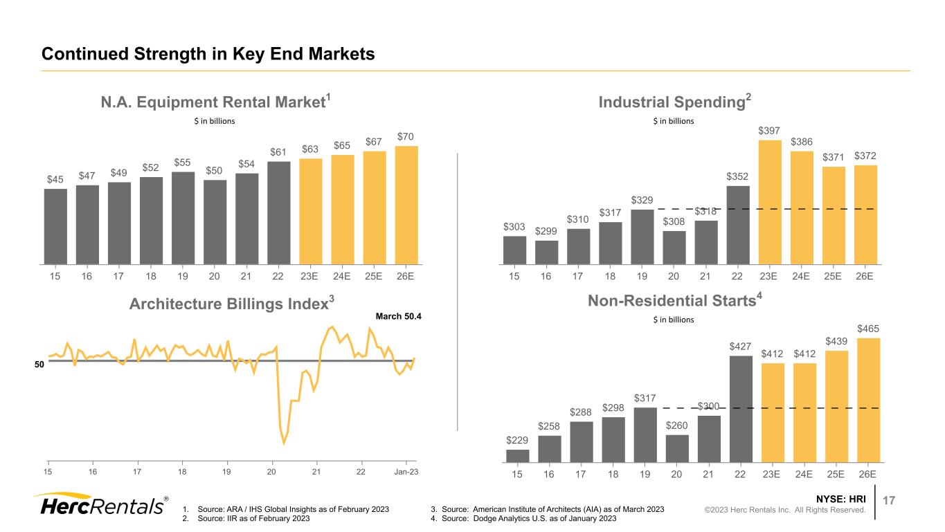 NYSE: HRI ©2023 Herc Rentals Inc. All Rights Reserved. 16 Disciplined Capital Management Maturities As of March 31, 2023 $ in millions $1,200 $1,673 $295 2023 2024 2025 2026 2027 No near-term maturities and ample liquidity2 of $1.5 billion provide financial flexibility Net capital expenditures outpaced cash flow from operations due to investments in growth, resulting in free cash outflow of $78 million for the first quarter Net leverage3 of 2.5x, compared with 2.4x in December 2022, within target range of 2.0x to 3.0x Quarterly dividend increased by 10% to $0.6325 per share, paid on March 9, 2023 to shareholders of record as of February 22, 2023 Q1 share repurchases of ~460,000 shares for $52 million Credit Ratings: Moody's upgraded HRI to Ba2 1. The AR Facility is excluded from current maturities of long-term debt as the Company has the intent and ability to consummate refinancing and extend the term of the agreement 2. Total liquidity includes cash and cash equivalents and the unused commitments under the ABL Credit Facility and AR Facility 3. For a definition and calculation, see the Appendix beginning on Slide 20 $64 Finance Leases 2023-2030 AR Facility1 ABL Credit Facility Senior Unsecured Notes Credit Ratings: Moody’s CFR Ba2 S&P BB-/Stable