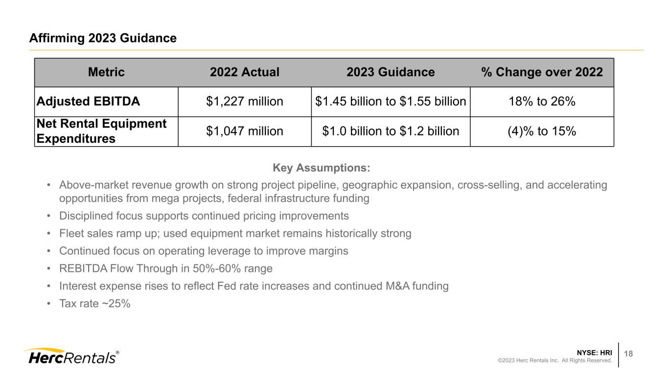 NYSE: HRI ©2023 Herc Rentals Inc. All Rights Reserved. 17 Continued Strength in Key End Markets N.A. Equipment Rental Market1 $45 $47 $49 $52 $55 $50 $54 $61 $63 $65 $67 $70 15 16 17 18 19 20 21 22 23E 24E 25E 26E 1. Source: ARA / IHS Global Insights as of February 2023 3. Source: American Institute of Architects (AIA) as of March 2023 2. Source: IIR as of February 2023 4. Source: Dodge Analytics U.S. as of January 2023 $ in billions Industrial Spending2 $303 $299 $310 $317 $329 $308 $318 $352 $397 $386 $371 $372 15 16 17 18 19 20 21 22 23E 24E 25E 26E $ in billions Non-Residential Starts4 $229 $258 $288 $298 $317 $260 $300 $427 $412 $412 $439 $465 15 16 17 18 19 20 21 22 23E 24E 25E 26E $ in billions — — — — — — — — — — — — — — — — — — — — — — — — — — — — — — — — Architecture Billings Index3 15 16 17 18 19 20 21 22 Jan-23 March 50.4 50