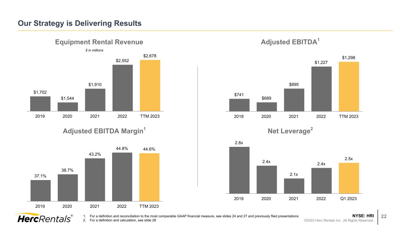 NYSE: HRI ©2023 Herc Rentals Inc. All Rights Reserved. 21 Glossary of Terms Commonly Used in the Industry OEC: Original Equipment Cost which is an operating measure based on the guidelines of the American Rental Association (ARA), which is calculated as the cost of the asset at the time it was first purchased plus additional capitalized refurbishment costs (with the basis of refurbished assets reset at the refurbishment date). Fleet Age: The OEC weighted age of the entire fleet, based on ARA guidelines. Net Fleet Capital Expenditures: Capital expenditures of rental equipment minus the proceeds from disposal of rental equipment. Dollar Utilization ($ UT): Dollar utilization is an operating measure calculated by dividing equipment rental revenue (excluding re-rent, delivery, pick-up and other ancillary revenue) by the average OEC of the equipment fleet for the relevant time period, based on ARA guidelines. Pricing: Change in pure pricing achieved in one period versus another period. This is applied both to year-over-year and sequential comparisons. Rental rates are based on ARA guidelines and are calculated based on the category class rate variance achieved either year-over-year or sequentially for any fleet that qualifies for the fleet base and weighted by the prior year revenue mix.