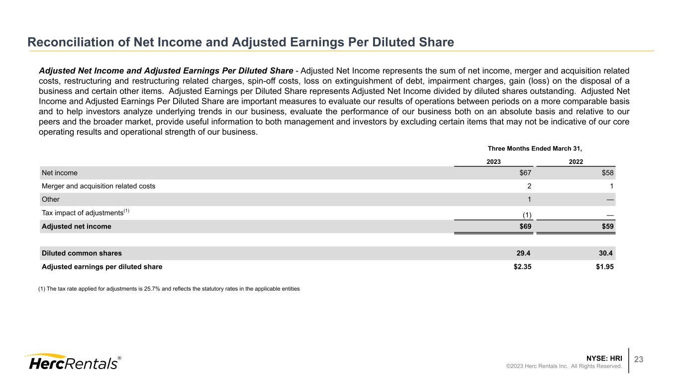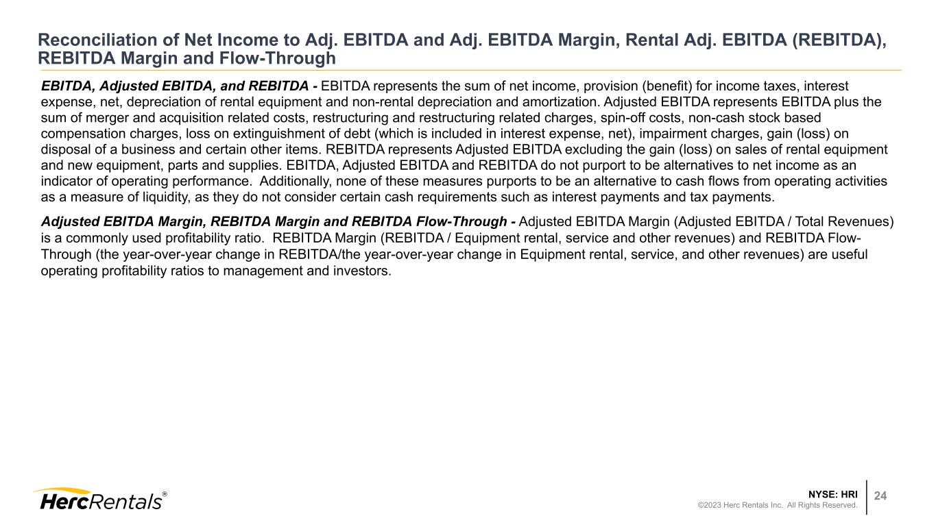 NYSE: HRI ©2023 Herc Rentals Inc. All Rights Reserved. 23 Reconciliation of Net Income and Adjusted Earnings Per Diluted Share Adjusted Net Income and Adjusted Earnings Per Diluted Share - Adjusted Net Income represents the sum of net income, merger and acquisition related costs, restructuring and restructuring related charges, spin-off costs, loss on extinguishment of debt, impairment charges, gain (loss) on the disposal of a business and certain other items. Adjusted Earnings per Diluted Share represents Adjusted Net Income divided by diluted shares outstanding. Adjusted Net Income and Adjusted Earnings Per Diluted Share are important measures to evaluate our results of operations between periods on a more comparable basis and to help investors analyze underlying trends in our business, evaluate the performance of our business both on an absolute basis and relative to our peers and the broader market, provide useful information to both management and investors by excluding certain items that may not be indicative of our core operating results and operational strength of our business. (1) The tax rate applied for adjustments is 25.7% and reflects the statutory rates in the applicable entities Three Months Ended March 31, 2023 2022 Net income $67 $58 Merger and acquisition related costs 2 1 Other 1 — Tax impact of adjustments(1) (1) — Adjusted net income $69 $59 Diluted common shares 29.4 30.4 Adjusted earnings per diluted share $2.35 $1.95