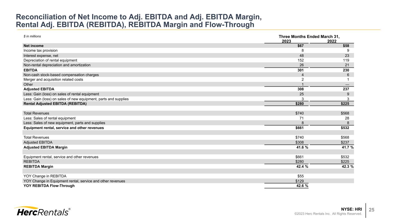 NYSE: HRI ©2023 Herc Rentals Inc. All Rights Reserved. 24 Reconciliation of Net Income to Adj. EBITDA and Adj. EBITDA Margin, Rental Adj. EBITDA (REBITDA), REBITDA Margin and Flow-Through EBITDA, Adjusted EBITDA, and REBITDA - EBITDA represents the sum of net income, provision (benefit) for income taxes, interest expense, net, depreciation of rental equipment and non-rental depreciation and amortization. Adjusted EBITDA represents EBITDA plus the sum of merger and acquisition related costs, restructuring and restructuring related charges, spin-off costs, non-cash stock based compensation charges, loss on extinguishment of debt (which is included in interest expense, net), impairment charges, gain (loss) on disposal of a business and certain other items. REBITDA represents Adjusted EBITDA excluding the gain (loss) on sales of rental equipment and new equipment, parts and supplies. EBITDA, Adjusted EBITDA and REBITDA do not purport to be alternatives to net income as an indicator of operating performance. Additionally, none of these measures purports to be an alternative to cash flows from operating activities as a measure of liquidity, as they do not consider certain cash requirements such as interest payments and tax payments. Adjusted EBITDA Margin, REBITDA Margin and REBITDA Flow-Through - Adjusted EBITDA Margin (Adjusted EBITDA / Total Revenues) is a commonly used profitability ratio. REBITDA Margin (REBITDA / Equipment rental, service and other revenues) and REBITDA Flow- Through (the year-over-year change in REBITDA/the year-over-year change in Equipment rental, service, and other revenues) are useful operating profitability ratios to management and investors.
