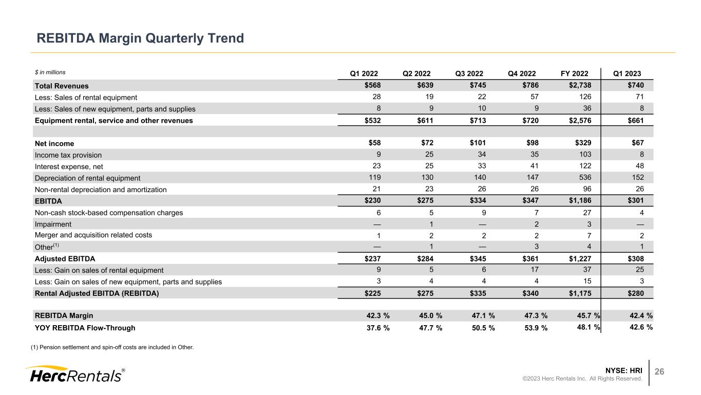 NYSE: HRI ©2023 Herc Rentals Inc. All Rights Reserved. 25 Reconciliation of Net Income to Adj. EBITDA and Adj. EBITDA Margin, Rental Adj. EBITDA (REBITDA), REBITDA Margin and Flow-Through $ in millions Three Months Ended March 31, 2023 2022 Net income $67 $58 Income tax provision 8 9 Interest expense, net 48 23 Depreciation of rental equipment 152 119 Non-rental depreciation and amortization 26 21 EBITDA 301 230 Non-cash stock-based compensation charges 4 6 Merger and acquisition related costs 2 1 Other 1 — Adjusted EBITDA 308 237 Less: Gain (loss) on sales of rental equipment 25 9 Less: Gain (loss) on sales of new equipment, parts and supplies 3 3 Rental Adjusted EBITDA (REBITDA) $280 $225 Total Revenues $740 $568 Less: Sales of rental equipment 71 28 Less: Sales of new equipment, parts and supplies 8 8 Equipment rental, service and other revenues $661 $532 Total Revenues $740 $568 Adjusted EBITDA $308 $237 Adjusted EBITDA Margin 41.6 % 41.7 % Equipment rental, service and other revenues $661 $532 REBITDA $280 $225 REBITDA Margin 42.4 % 42.3 % YOY Change in REBITDA $55 YOY Change in Equipment rental, service and other revenues $129 YOY REBITDA Flow-Through 42.6 %