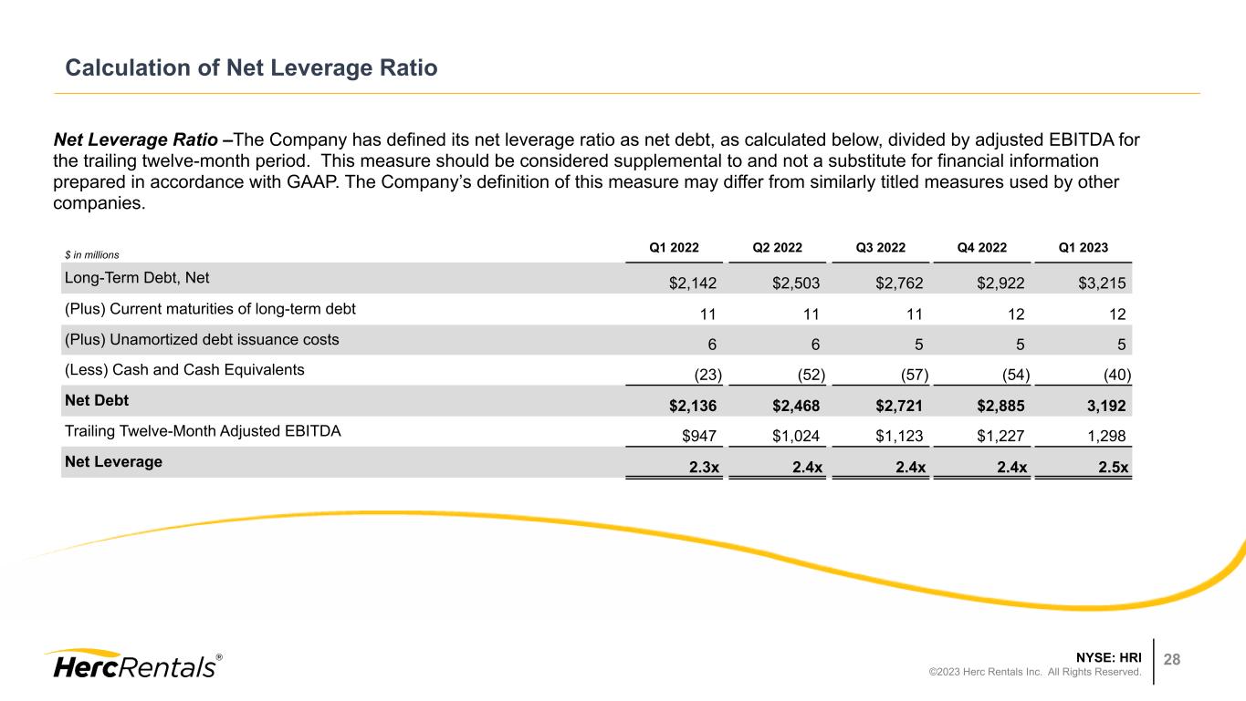 NYSE: HRI ©2023 Herc Rentals Inc. All Rights Reserved. 27 REBITDA Margin Annual Trend $ in millions 2018 2019 2020 2021 2022 Total Revenues $1,978 $1,999 $1,781 $2,074 $2,738 Less: Sales of rental equipment 256 242 198 113 126 Less: Sales of new equipment, parts and supplies 49 44 28 31 36 Equipment rental, service and other revenues $1,673 $1,713 $1,555 $1,930 $2,576 Net income $69 $47 $74 $224 $329 Income tax provision (benefit) — 16 21 67 103 Interest expense, net 137 174 92 86 122 Depreciation of rental equipment 387 410 403 420 536 Non-rental depreciation and amortization 58 62 64 68 96 EBITDA $651 $709 $654 $865 $1,186 Restructuring 5 8 1 — — Spin-off costs 15 — — — 1 Non-cash stock-based compensation charges 14 19 16 23 27 Impairment — 4 15 3 3 Merger and acquisition related costs — — — 3 7 Loss on disposal of business — — 3 — — Other 1 1 — 1 3 Adjusted EBITDA $686 $741 $689 $895 $1,227 Less: Gain (loss) on sales of rental equipment 12 (2) (5) 20 37 Less: Gain on sales of new equipment, parts and supplies 11 11 8 10 15 Rental Adjusted EBITDA (REBITDA) $663 $732 $686 $865 $1,175 REBITDA Margin 39.6 % 42.7 % 44.2 % 44.8 % 45.7 % YOY REBITDA Flow-Through 54.8 % 169.3 % 27.9 % 47.5 % 48.1 %