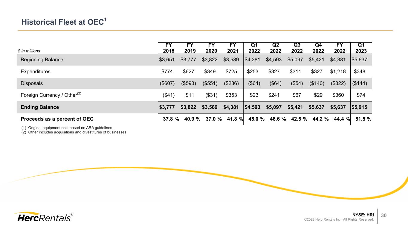 NYSE: HRI ©2023 Herc Rentals Inc. All Rights Reserved. 29 Reconciliation of Free Cash Flow Free cash flow is not a recognized term under GAAP and should not be considered in isolation or as a substitute for our reported results prepared in accordance with GAAP. Further, since all companies do not use identical calculations, our definition and presentation of this measure may not be comparable to similarly titled measures reported by other companies. Free cash flow represents net cash provided by (used in) operating activities less rental equipment expenditures and non-rental capital expenditures, plus proceeds from disposal of rental equipment, proceeds from disposal of property and equipment, and other investing activities. Free cash flow is used by management in analyzing the Company’s ability to service and repay its debt, fund potential acquisitions and to forecast future periods. However, this measure does not represent funds available for investment or other discretionary uses since it does not deduct cash used to service debt or for other non-discretionary expenditures. $ in millions Three Months Ended March 31, Year Ended December 31, 2023 2022 2021 2020 2019 Net cash provided by operating activities $235 $143 $744 $611 $636 Rental equipment expenditures (332) (287) (594) (344) (638) Proceeds from disposal of rental equipment 49 29 107 193 224 Net Fleet Capital Expenditures (283) (258) (487) (151) (414) Non-rental capital expenditures (33) (13) (48) (41) (57) Proceeds from disposal of property and equipment 3 2 5 7 8 Other — (5) — — 4 Free Cash Flow (78) (131) 214 426 177 Acquisitions, net of cash acquired (138) (73) (431) (46) (4) Proceeds from disposal of business — — — 25 — (Increase) decrease in Net Debt, excluding financing activities ($216) ($204) ($217) $405 $173