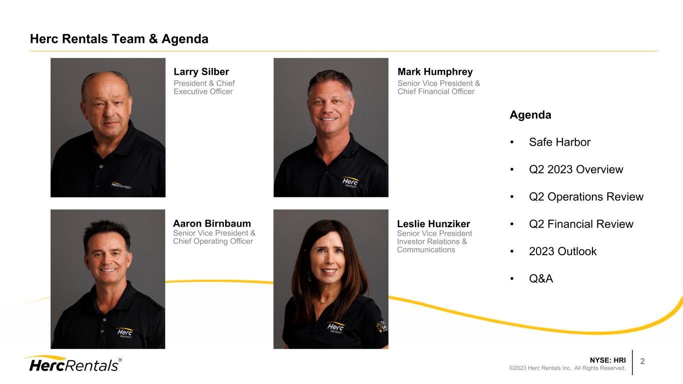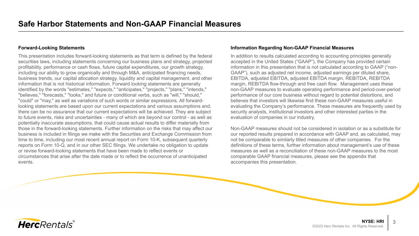 NYSE: HRI ©2023 Herc Rentals Inc. All Rights Reserved. 2 Larry Silber President & Chief Executive Officer Herc Rentals Team & Agenda Aaron Birnbaum Senior Vice President & Chief Operating Officer Agenda • Safe Harbor • Q2 2023 Overview • Q2 Operations Review • Q2 Financial Review • 2023 Outlook • Q&A Leslie Hunziker Senior Vice President Investor Relations & Communications Mark Humphrey Senior Vice President & Chief Financial Officer