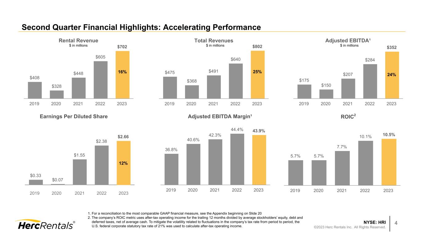 NYSE: HRI ©2023 Herc Rentals Inc. All Rights Reserved. 3 Safe Harbor Statements and Non-GAAP Financial Measures Forward-Looking Statements This presentation includes forward-looking statements as that term is defined by the federal securities laws, including statements concerning our business plans and strategy, projected profitability, performance or cash flows, future capital expenditures, our growth strategy, including our ability to grow organically and through M&A, anticipated financing needs, business trends, our capital allocation strategy, liquidity and capital management, and other information that is not historical information. Forward looking statements are generally identified by the words "estimates," "expects," "anticipates," "projects," "plans," "intends," "believes," "forecasts," "looks," and future or conditional verbs, such as "will," "should," "could" or "may," as well as variations of such words or similar expressions. All forward- looking statements are based upon our current expectations and various assumptions and, there can be no assurance that our current expectations will be achieved. They are subject to future events, risks and uncertainties - many of which are beyond our control - as well as potentially inaccurate assumptions, that could cause actual results to differ materially from those in the forward-looking statements. Further information on the risks that may affect our business is included in filings we make with the Securities and Exchange Commission from time to time, including our most recent annual report on Form 10-K, subsequent quarterly reports on Form 10-Q, and in our other SEC filings. We undertake no obligation to update or revise forward-looking statements that have been made to reflect events or circumstances that arise after the date made or to reflect the occurrence of unanticipated events. Information Regarding Non-GAAP Financial Measures In addition to results calculated according to accounting principles generally accepted in the United States (“GAAP”), the Company has provided certain information in this presentation that is not calculated according to GAAP (“non- GAAP”), such as adjusted net income, adjusted earnings per diluted share, EBITDA, adjusted EBITDA, adjusted EBITDA margin, REBITDA, REBITDA margin, REBITDA flow-through and free cash flow. Management uses these non-GAAP measures to evaluate operating performance and period-over-period performance of our core business without regard to potential distortions, and believes that investors will likewise find these non-GAAP measures useful in evaluating the Company’s performance. These measures are frequently used by security analysts, institutional investors and other interested parties in the evaluation of companies in our industry. Non-GAAP measures should not be considered in isolation or as a substitute for our reported results prepared in accordance with GAAP and, as calculated, may not be comparable to similarly titled measures of other companies. For the definitions of these terms, further information about management’s use of these measures as well as a reconciliation of these non-GAAP measures to the most comparable GAAP financial measures, please see the appendix that accompanies this presentation.