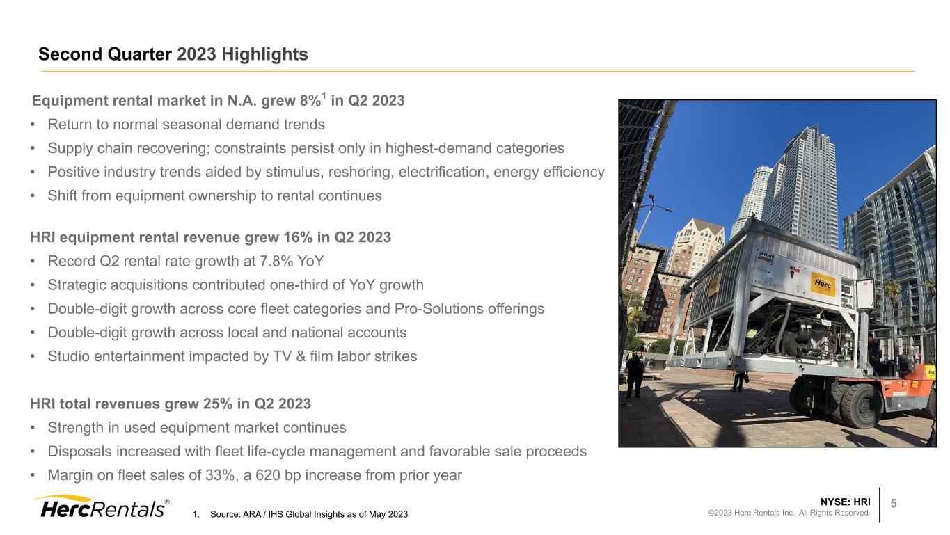 NYSE: HRI ©2023 Herc Rentals Inc. All Rights Reserved. 4 Rental Revenue $408 $328 $448 $605 $702 2019 2020 2021 2022 2023 Total Revenues $475 $368 $491 $640 $802 2019 2020 2021 2022 2023 Adjusted EBITDA¹ $175 $150 $207 $284 $352 2019 2020 2021 2022 2023 36.8% 40.6% 42.3% 44.4% 43.9% 2019 2020 2021 2022 2023 $0.33 $0.07 $1.55 $2.38 $2.66 16% 24%25% $ in millions $ in millions $ in millions 12% Adjusted EBITDA Margin¹Earnings Per Diluted Share ROIC2 1. For a reconciliation to the most comparable GAAP financial measure, see the Appendix beginning on Slide 20 2. The company’s ROIC metric uses after-tax operating income for the trailing 12 months divided by average stockholders’ equity, debt and deferred taxes, net of average cash. To mitigate the volatility related to fluctuations in the company’s tax rate from period to period, the U.S. federal corporate statutory tax rate of 21% was used to calculate after-tax operating income. 5.7% 5.7% 7.7% 10.1% 10.5% 2019 2020 2021 2022 2023 Second Quarter Financial Highlights: Accelerating Performance 2019 2020 2021 2022 2023
