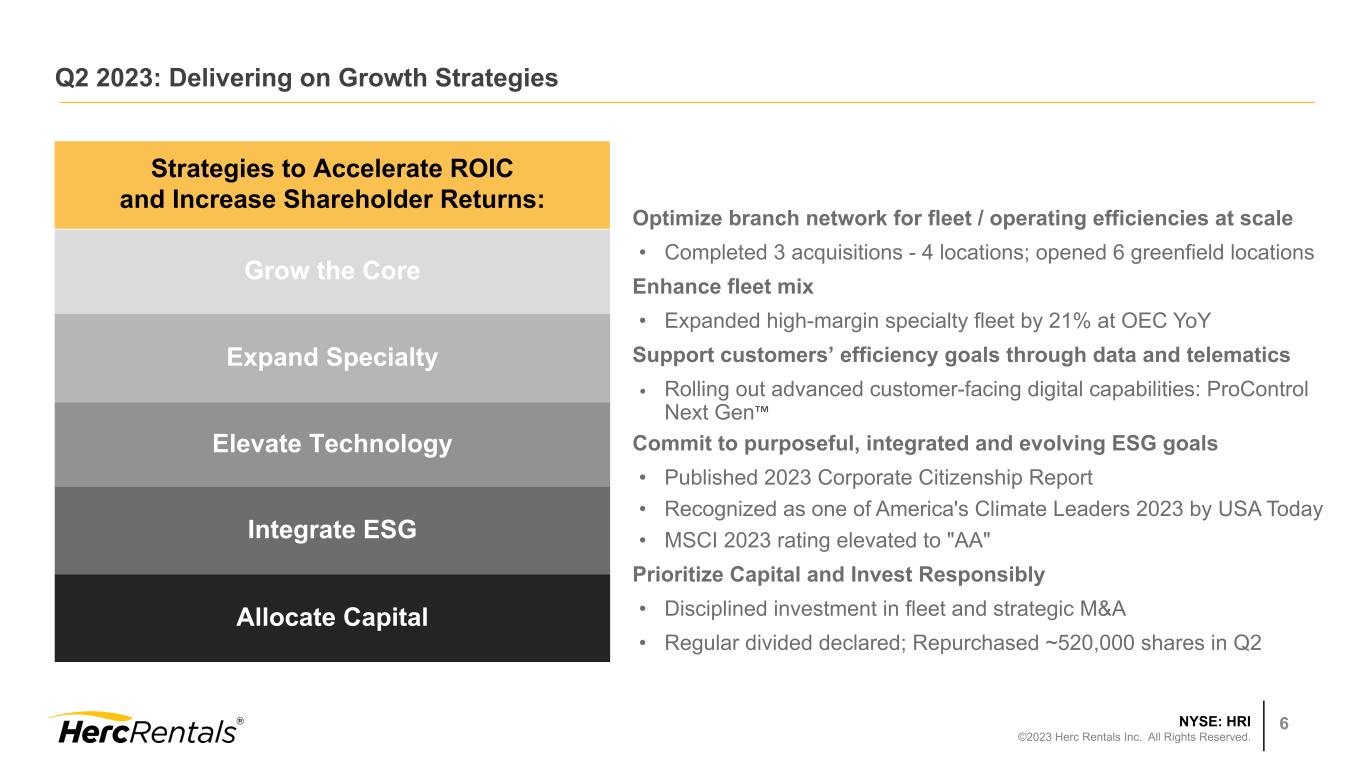 NYSE: HRI ©2023 Herc Rentals Inc. All Rights Reserved. 5 Equipment rental market in N.A. grew 8%1 in Q2 2023 • Return to normal seasonal demand trends • Supply chain recovering; constraints persist only in highest-demand categories • Positive industry trends aided by stimulus, reshoring, electrification, energy efficiency • Shift from equipment ownership to rental continues HRI equipment rental revenue grew 16% in Q2 2023 • Record Q2 rental rate growth at 7.8% YoY • Strategic acquisitions contributed one-third of YoY growth • Double-digit growth across core fleet categories and Pro-Solutions offerings • Double-digit growth across local and national accounts • Studio entertainment impacted by TV & film labor strikes HRI total revenues grew 25% in Q2 2023 • Strength in used equipment market continues • Disposals increased with fleet life-cycle management and favorable sale proceeds • Margin on fleet sales of 33%, a 620 bp increase from prior year Second Quarter 2023 Highlights 1. Source: ARA / IHS Global Insights as of May 2023