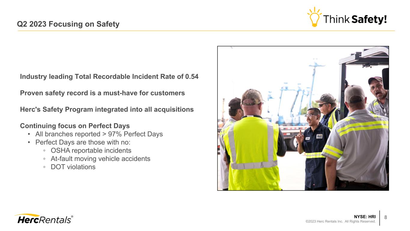 NYSE: HRI ©2023 Herc Rentals Inc. All Rights Reserved. 6 Optimize branch network for fleet / operating efficiencies at scale • Completed 3 acquisitions - 4 locations; opened 6 greenfield locations Enhance fleet mix • Expanded high-margin specialty fleet by 21% at OEC YoY Support customers’ efficiency goals through data and telematics • Rolling out advanced customer-facing digital capabilities: ProControl Next Gen™ Commit to purposeful, integrated and evolving ESG goals • Published 2023 Corporate Citizenship Report • Recognized as one of America's Climate Leaders 2023 by USA Today • MSCI 2023 rating elevated to "AA" Prioritize Capital and Invest Responsibly • Disciplined investment in fleet and strategic M&A • Regular divided declared; Repurchased ~520,000 shares in Q2 Q2 2023: Delivering on Growth Strategies Grow the Core Expand Specialty Elevate Technology Integrate ESG Allocate Capital Strategies to Accelerate ROIC and Increase Shareholder Returns: