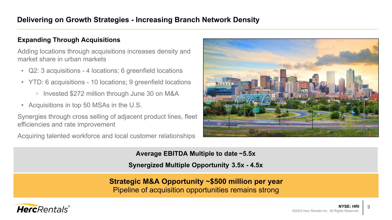 NYSE: HRI ©2023 Herc Rentals Inc. All Rights Reserved. 8 Q2 2023 Focusing on Safety Industry leading Total Recordable Incident Rate of 0.54 Proven safety record is a must-have for customers Herc's Safety Program integrated into all acquisitions Continuing focus on Perfect Days • All branches reported > 97% Perfect Days • Perfect Days are those with no: ◦ OSHA reportable incidents ◦ At-fault moving vehicle accidents ◦ DOT violations