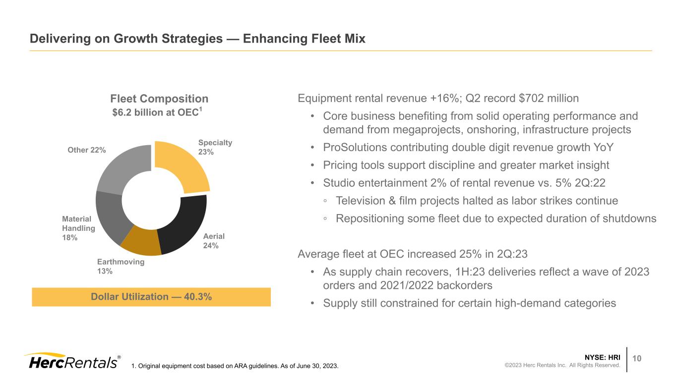 NYSE: HRI ©2023 Herc Rentals Inc. All Rights Reserved. 9 Delivering on Growth Strategies - Increasing Branch Network Density Expanding Through Acquisitions Adding locations through acquisitions increases density and market share in urban markets • Q2: 3 acquisitions - 4 locations; 6 greenfield locations • YTD: 6 acquisitions - 10 locations; 9 greenfield locations ◦ Invested $272 million through June 30 on M&A • Acquisitions in top 50 MSAs in the U.S. Synergies through cross selling of adjacent product lines, fleet efficiencies and rate improvement Acquiring talented workforce and local customer relationships Strategic M&A Opportunity ~$500 million per year Pipeline of acquisition opportunities remains strong Average EBITDA Multiple to date ~5.5x Synergized Multiple Opportunity 3.5x - 4.5x