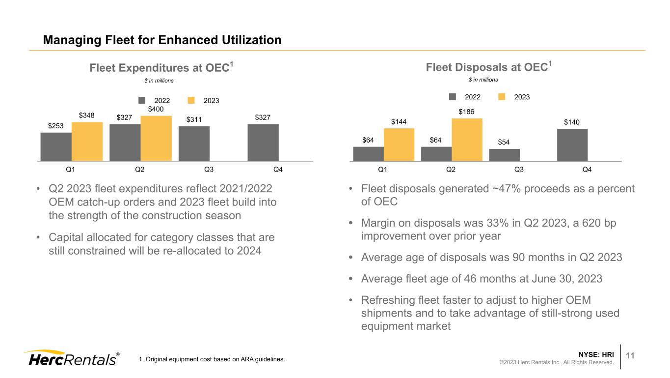 NYSE: HRI ©2023 Herc Rentals Inc. All Rights Reserved. 10 Equipment rental revenue +16%; Q2 record $702 million • Core business benefiting from solid operating performance and demand from megaprojects, onshoring, infrastructure projects • ProSolutions contributing double digit revenue growth YoY • Pricing tools support discipline and greater market insight • Studio entertainment 2% of rental revenue vs. 5% 2Q:22 ◦ Television & film projects halted as labor strikes continue ◦ Repositioning some fleet due to expected duration of shutdowns Average fleet at OEC increased 25% in 2Q:23 • As supply chain recovers, 1H:23 deliveries reflect a wave of 2023 orders and 2021/2022 backorders • Supply still constrained for certain high-demand categories Delivering on Growth Strategies — Enhancing Fleet Mix Specialty 23% Aerial 24% Earthmoving 13% Material Handling 18% Other 22% Fleet Composition $6.2 billion at OEC1 Dollar Utilization — 40.3% 1. Original equipment cost based on ARA guidelines. As of June 30, 2023.